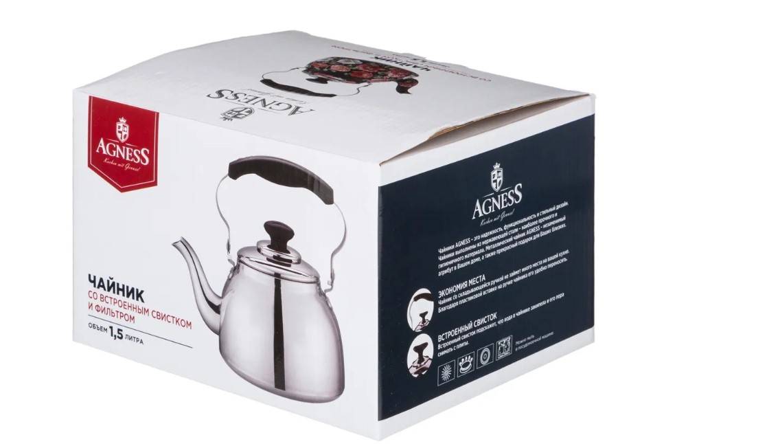 Чайник ТМ AGNESS - это надежность, функциональность и стильный дизайн. Чайник выполнен из нержавеющей стали - наиболее прочного и гигиеничного материала. Складывающая ручка позволит сэкономить место во время хранения. Благодаря пластиковой вставке на рукче удобно переносить. ТМ AGNESS - готовьте с удовольствием