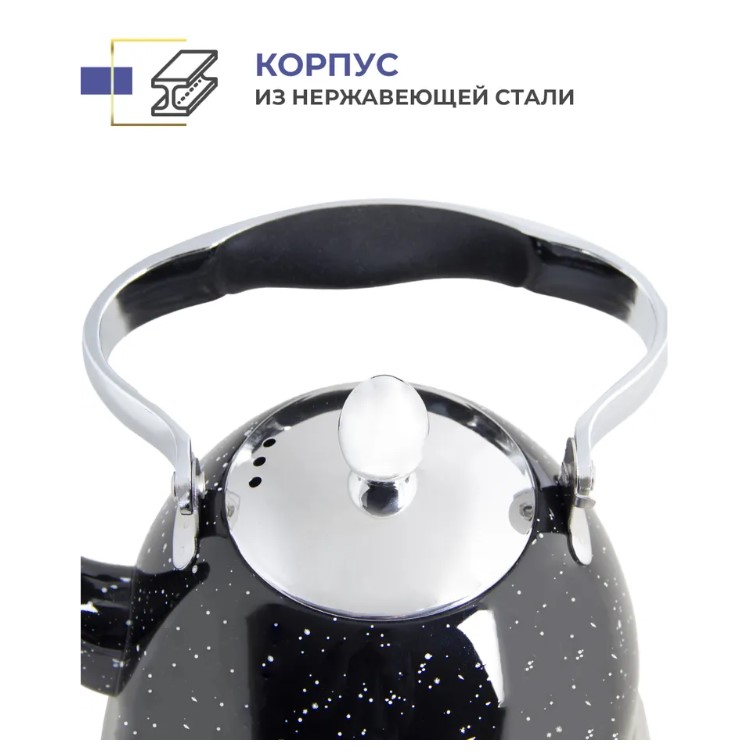 Чайник подходит для всех видов плит, включая индукционные. Корпус чайника выполнен из высококачественной нержавеющей стали.