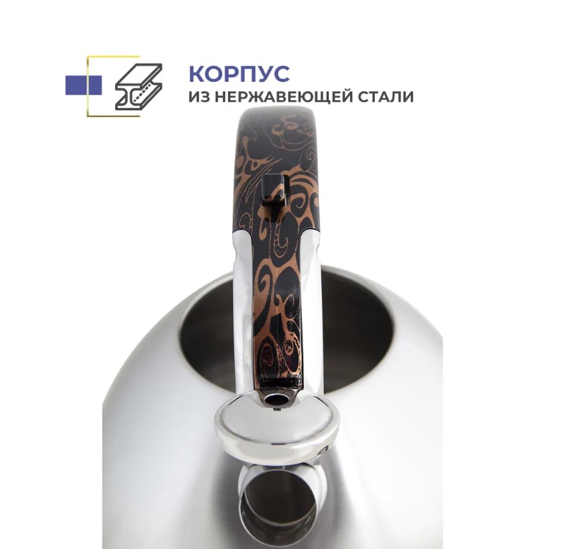 Чайник подходит для всех видов плит, включая индукционные. Корпус чайника выполнен из высококачественной нержавеющей стали.