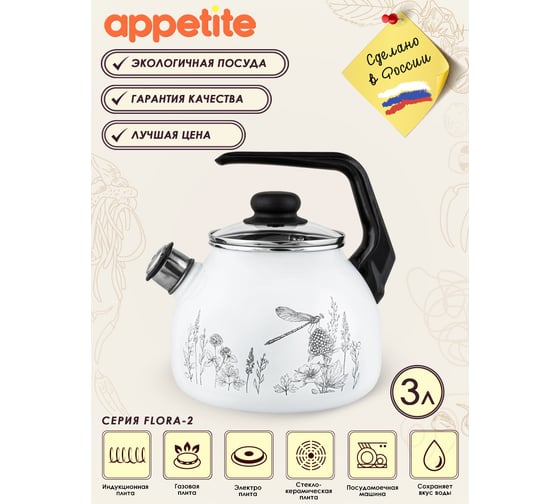 Эмалированный чайник appetite FLORA-2 3 л со свистком 4с209я FLORA предназначен для кипячения воды.