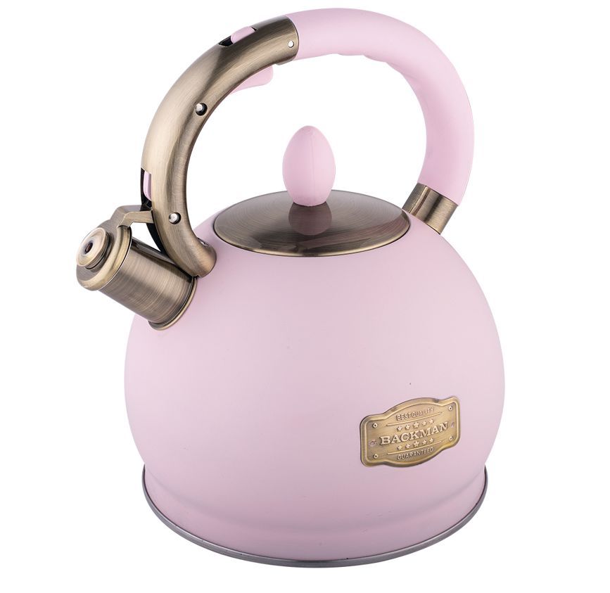 BACKMAN BM-0702 CAMILLE 3л Чайник со свистком BACKMAN BM-0702 3,0 л , Чайник со свистком, 3,0 л, нержавеющая сталь, капсулированное индукционное дно, курковый механизм, внешнее покрытие - антипригарное цветное покрытие, устойчивое к высоким температурам, комбинированная ручка с покрытием "soft-touch", ДЕКОРАТИВНЫЕ ЭЛЕМЕНТЫ "ПОД БРОНЗУ". Подарочная упаковка.