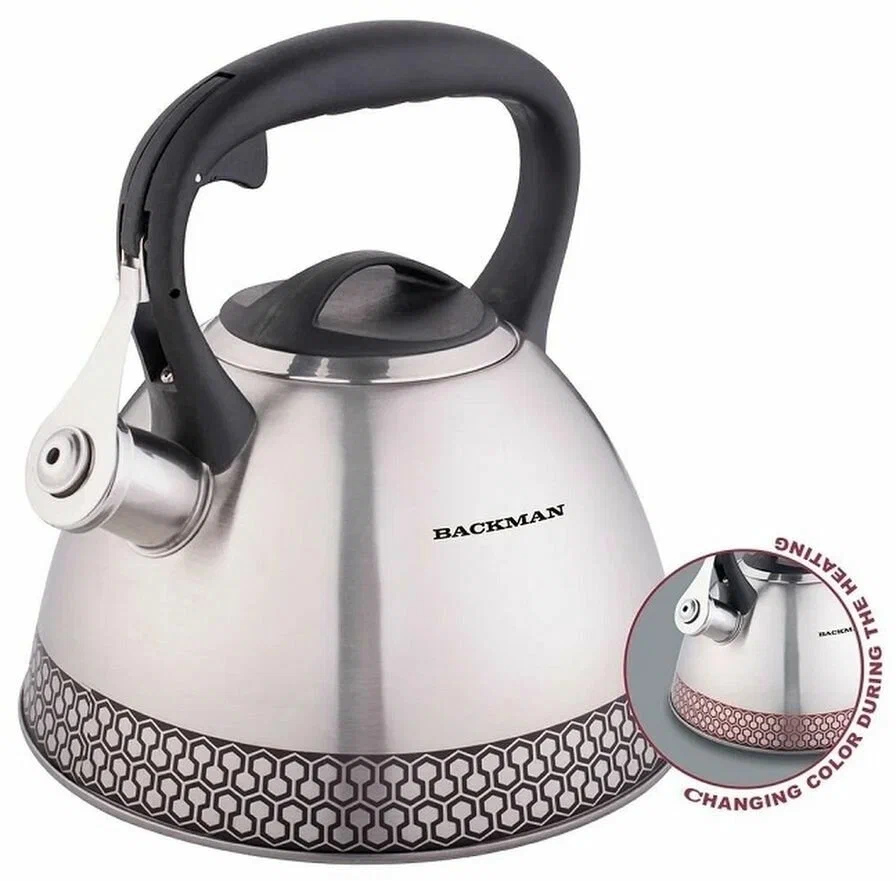 Объём: 3,0л; Материал корпуса: нержавеющая сталь; Матовая полировка корпуса с терморисунком, меняющим цвет при нагревании; Ручка из бакелита; Курковый механизм; Удобная ненагревающаяся ручка; Подходит для всех видов кухонных плит; Подарочная упаковка.