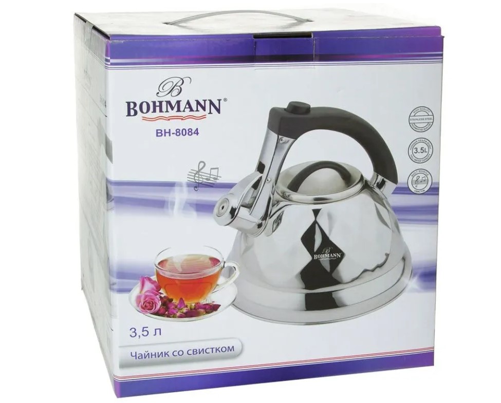 Чайник со свистком Bohmann BH-8084 оборудован свистком для определения закипания воды и изготовлен из высококачественной нержавеющей стали. Корпус из данного материала долговечен, не подвергается коррозии и обладает антиаллергенными свойствами. Фиксированная ручка модели удобно ложится в ладонь. На ней находится механизм открытия носика-свистка. Широкое капсульное дно распределяет тепло равномерно по всей поверхности, что обеспечивает быструю скорость закипания воды и устойчивость изделия. Крышка практически не пропускает пар, поэтому вода долго остается горячей. Изящная форма чайника и отполированная поверхность корпуса придают ему эстетичности на столе.Подходит для использования на индукционной плите и мытья в посудомоечной машине.