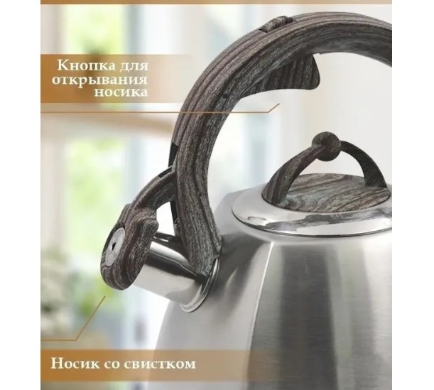 Чайник изготовлен из высококачественной нержавеющей стали c декоративным покрытием. Термостойкая, эргономичная ручка, выполненная из нержавеющей стали и бакелита, удобно лежит в руке. Носик чайника оснащен насадкой-свистком, который позволяет контролировать процесс кипячения или подогрева воды. Особая конструкция дна чайничка способствует высокой теплопроводности и равномерному распределению тепла. Эстетичный и функциональный, с современным дизайном чайник для плиты украсит любую кухню и создаст атмосферу домашнего уюта. Компактный чайник со свистком пригодится для отдыха на природе, для пикников, походов, охота, рыбалка и поездок за город. Чайник подходит для индукционной плиты.