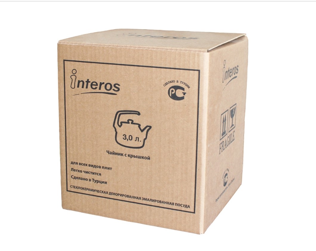 Эмалированный чайник тм INTEROS изготовлен из высококачественной стали и покрыт плотной двухслойной стеклокерамической эмалью с содержанием фарфора. Ручка чайника изготовлена из жаропрочного бакелита, во время кипячения не нагревается, удобство в пользовании.
