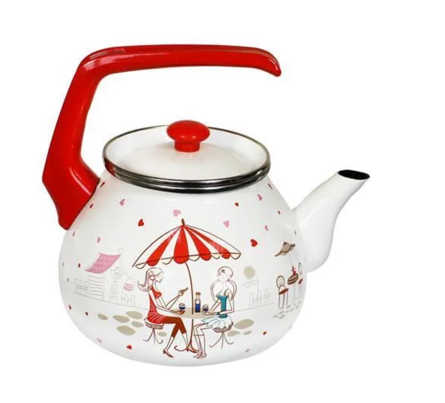 Эмалированный чайник изготовлен из высококачественной стали и покрыт плотной двухслойной стеклокерамической эмалью с содержанием фарфора. Ручка чайника изготовлена из жаропрочного бакелита, во время кипячения не нагревается, удобство в пользовании. Также имеется крышка с пластиковой кнопкой для удобного извлечения из чайника. Посуда создана из экологичного природного сырья и соответствует стандартам ГОСТ, что гарантирует отсутствие химических реакций и сохраняет вкус при приготовлении напитка. Уникальный дизайн посуды украсит любую кухню и создаст атмосферу домашнего уюта.