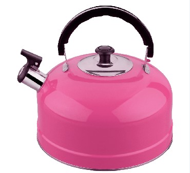 Чайник из нержавеющей стали со свистком, объем 2,5 л. Изготовлен из высококачественной нержавеющей стали, однослойное дно. Подвижная ручка из термостойкого пластика. Ручка не нагревается. Цвет розовый. Полезный объем 2 л.