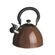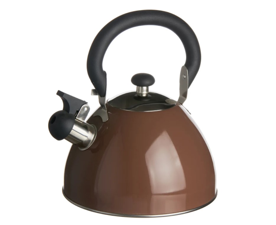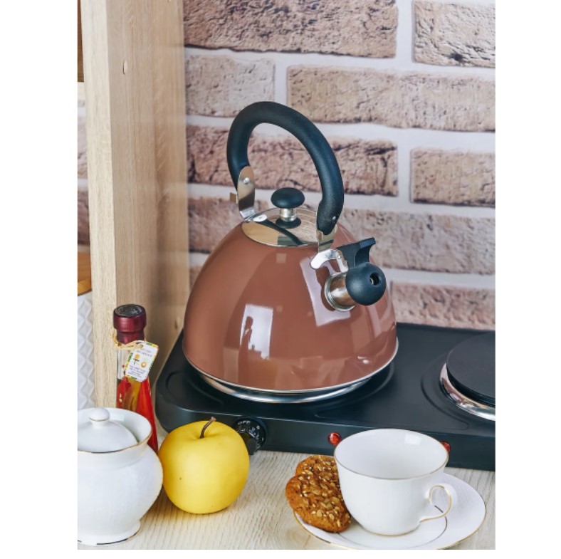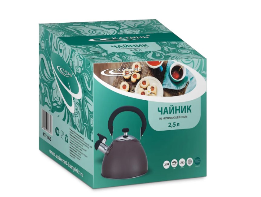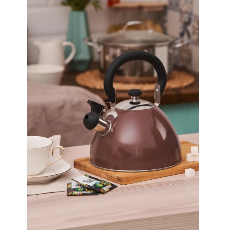 Чайник изготовлен из высококачественной нержавеющей стали. Бакелитовые ручки чайника практически не нагреваются, а курковый механизм позволяет легко поднимать насадку-свисток. Чайник имеет цветное внешнее покрытие, цвет бирюзовый. Широкое цельнометаллическое однослойное дно распределяет тепло равномерно по всей поверхности, что обеспечивает быструю скорость закипания воды и устойчивость изделия. Подходит для всех видов плит, кроме индукционных.