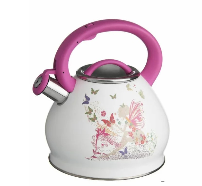 Чайник для плит Катунь KT 132 выполнен в оригинальном дизайне с рисунком «Бабочки». Белый корпус из нержавеющей стали и ручками фиолетового цвета. Ручки не нагреваются в процессе закипания. Рисунок при нагревании меняет цвет. Удобная насадка-свисток оповестит пользователя, что вода нагрелась. Благодаря своему составу чайник прослужит Вам долго. Подходит для любых типов плит, так же и индукционных. Для большинства людей понравится объем чайника – 2,5 литра.