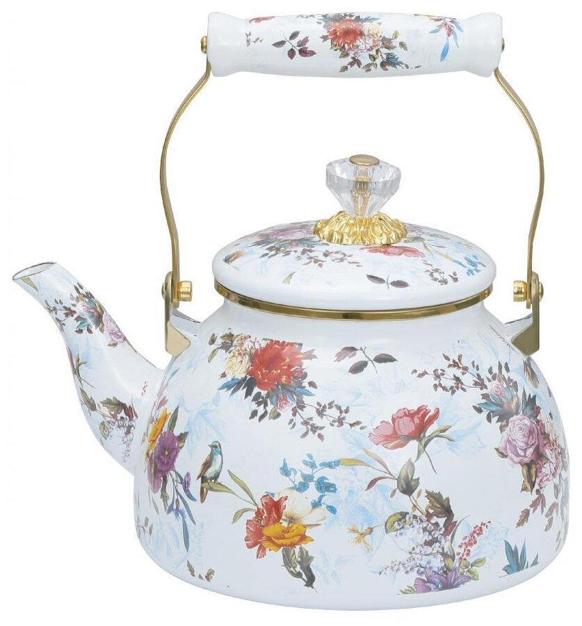 Чайник эмалированный. Эмалевое покрытие защищает пищу от проникновения ионов металлов, к тому же, на гладкой поверхности эмали не способны размножаться бактерии. Удобная ручка не нагревается. Неповторимость дизайна. Пригоден для всех видов плит.