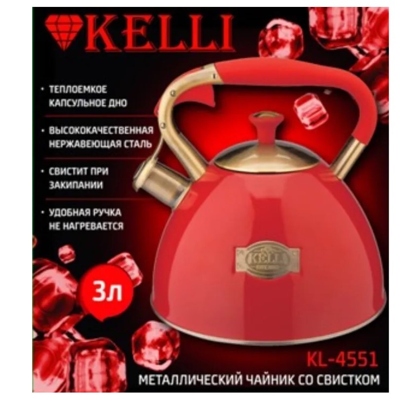 Металлический чайник для плиты Kelli KL-4551 со свистком. Объем: 3 литра. Изготовлен из высококачественной нержавеющей стали. Ручка чайника не нагревается. Оригинальный дизайн впишется в любую кухню. Чайник свистит при закипании. Теплоемкое капсульное дно. Подходит для всех видов плит.