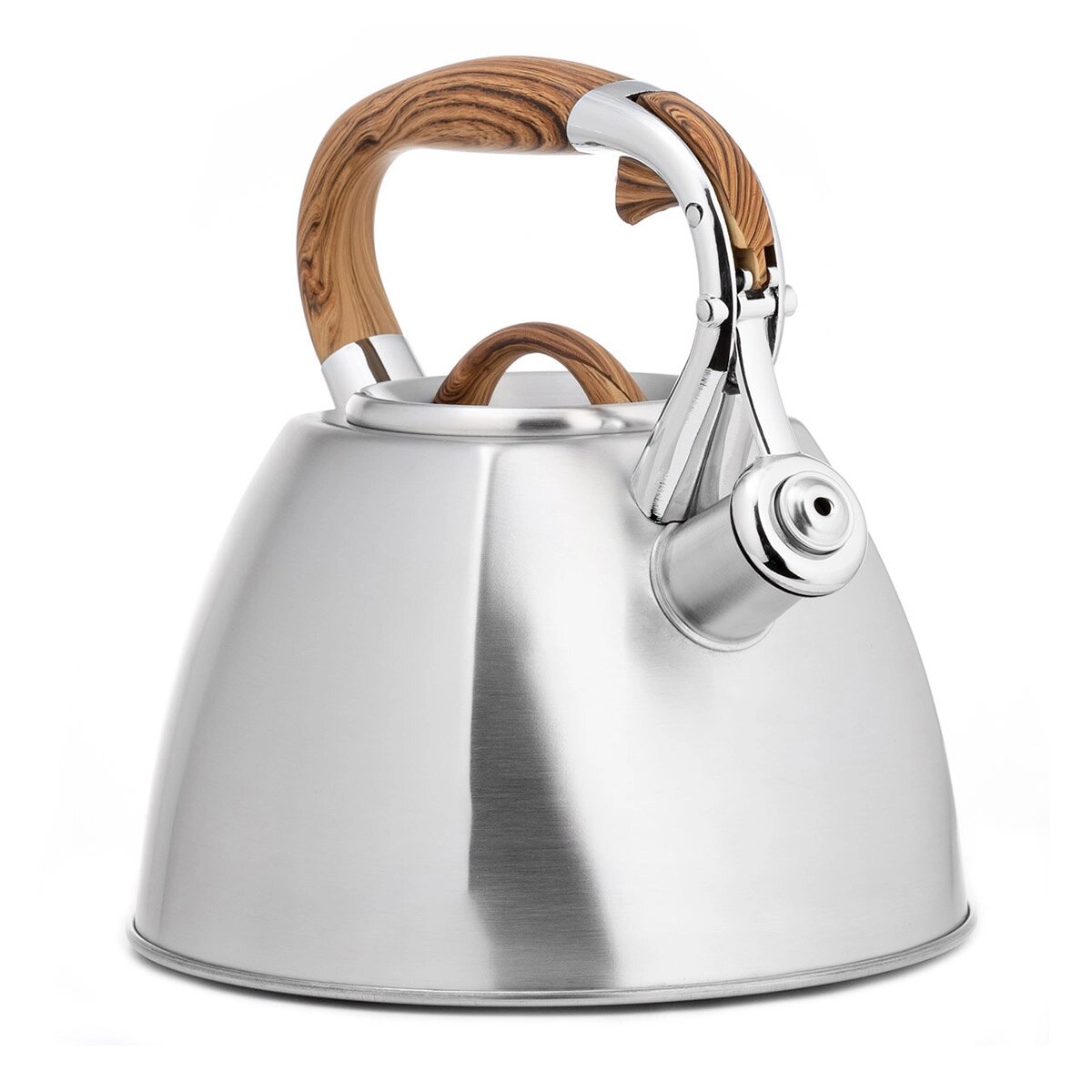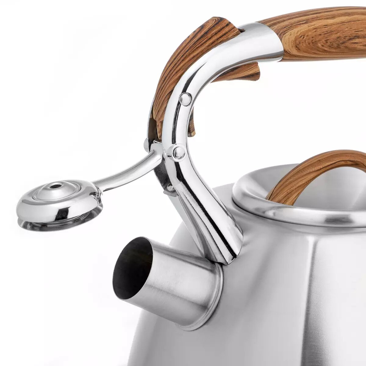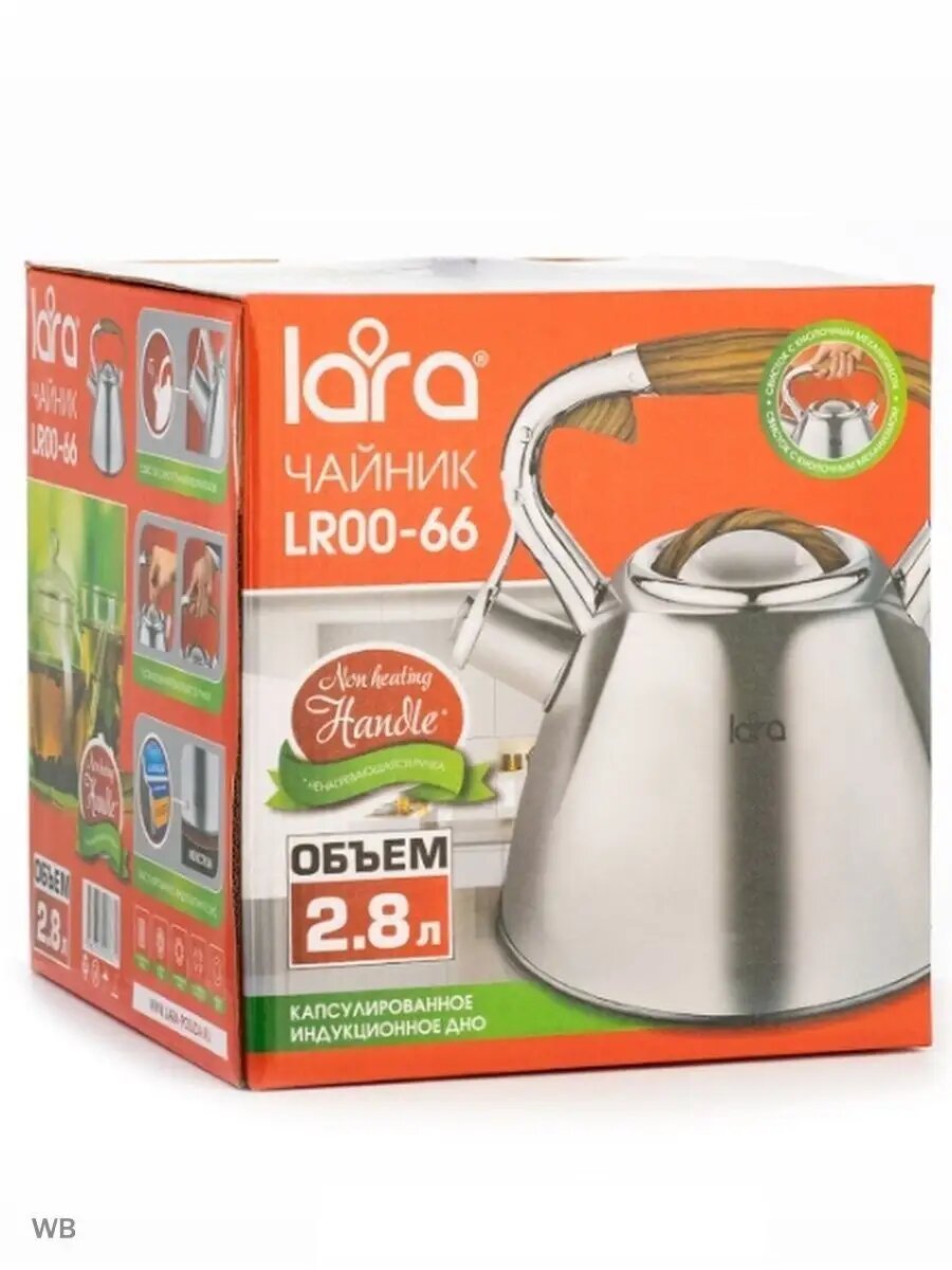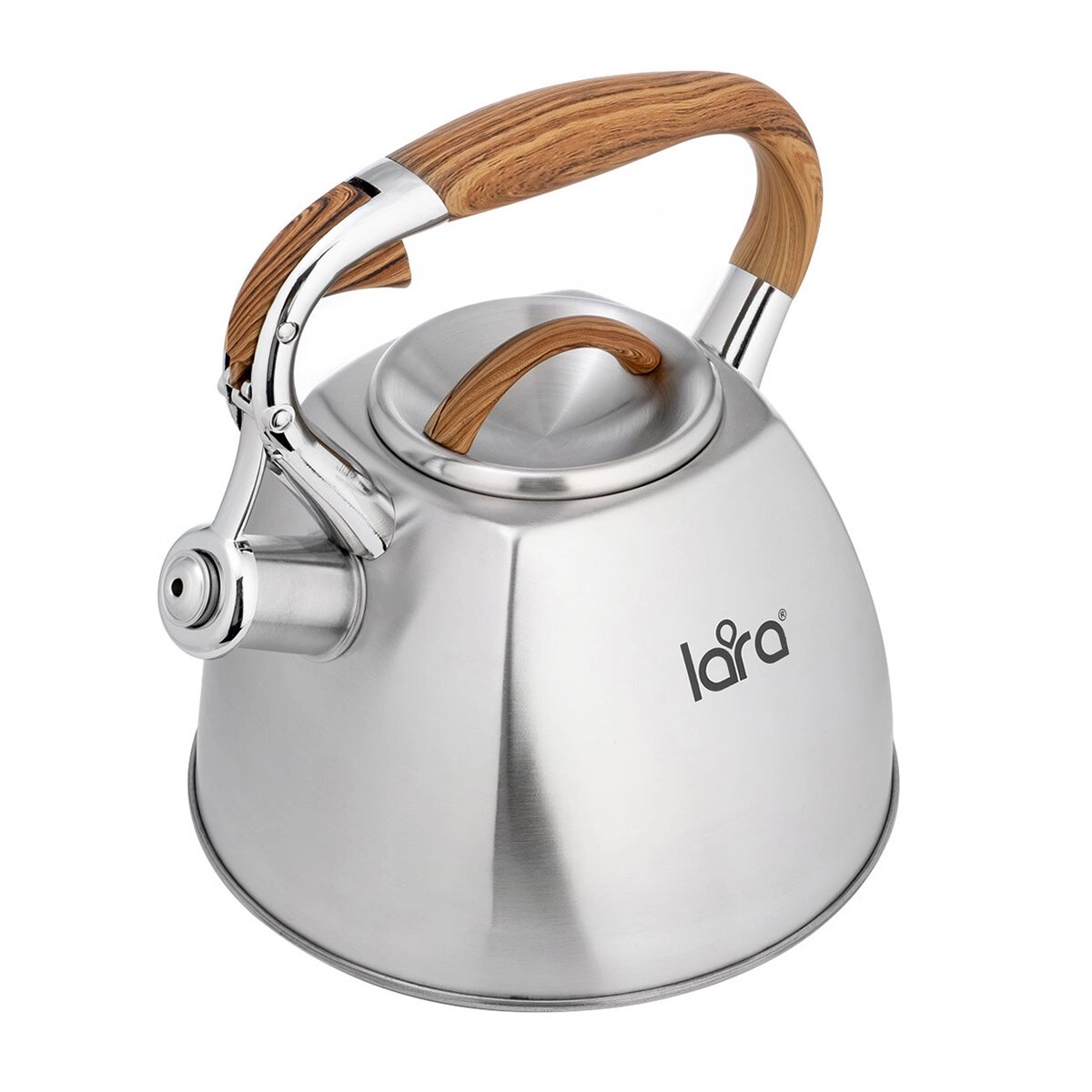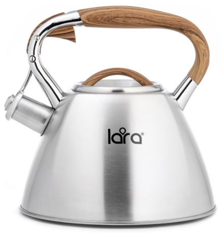 Современный чайник со свистком LARA в четырехгранном корпусе. Сочетание матовой полировки корпуса и деревянной фактуры придется по душе каждому. Объема чайника достаточно для небольшой семьи, поэтому нет необходимости лишний раз кипятить воду. Чайник изготовлен из высококачественной нержавеющей стали. Он оснащен свистком с безопасным кнопочным механизмом. Ручка из ненагревающегося пластика окрашена под дерево и имеет приятное на ощупь силиконовое покрытие Soft-touch. Стальное индукционное капсулированное дно подходит для всех типов плит.