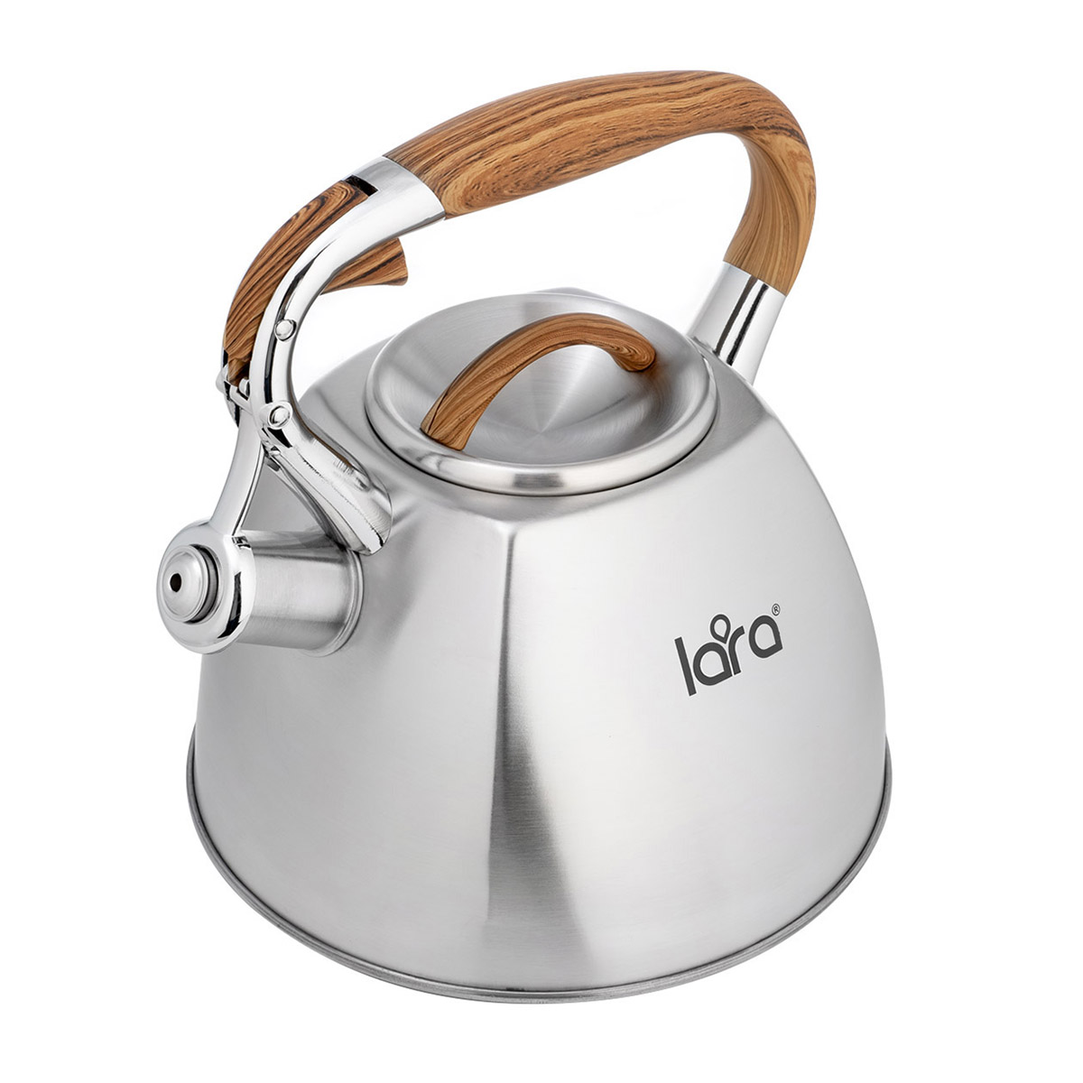 Современный чайник со свистком LARA в четырехгранном корпусе. Сочетание матовой полировки корпуса и деревянной фактуры придется по душе каждому. Объема чайника достаточно для небольшой семьи, поэтому нет необходимости лишний раз кипятить воду. Чайник изготовлен из высококачественной нержавеющей стали. Он оснащен свистком с безопасным кнопочным механизмом. Ручка из ненагревающегося пластика окрашена под дерево и имеет приятное на ощупь силиконовое покрытие Soft-touch. Толстое индукционное капсулированное дно подходит для всех типов плит.