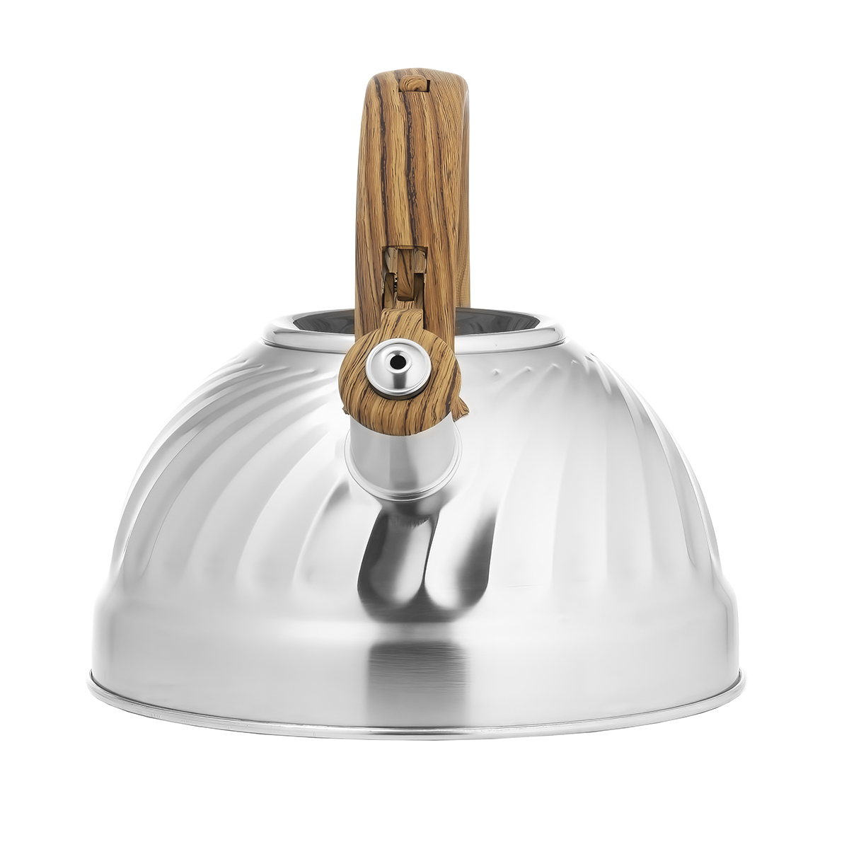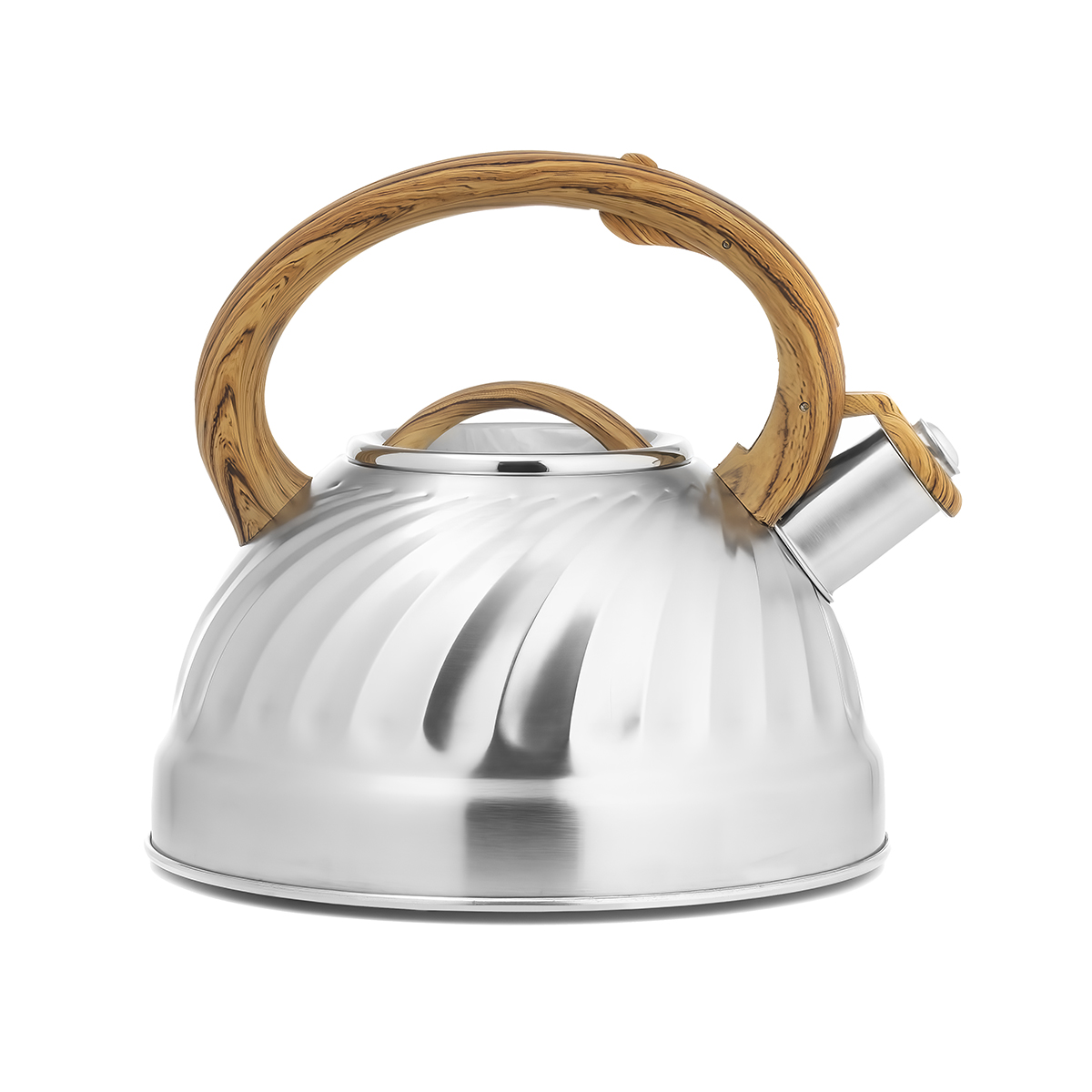 Чайник со свистком LARA классической формы с рельефным декором корпуса станет настоящим помощник на вашей кухне. Он без проблем вскипятит необходимый объем воды, а свисток не позволит пропустить момент закипания. Эргономичная ручка с механизмом открывания свистка позволит безопасно использовать его одной рукой. Чайник изготовлен из высококачественной нержавеющей стали с комбинированной матовой и зеркальной отделкой корпуса. Ненагревающиеся пластиковые ручки окрашены под дерево и имеют приятное на ощупь силиконовое покрытие Soft-touch. Толстое индукционное капсулированное дно подходит для использования на всех типах плит.