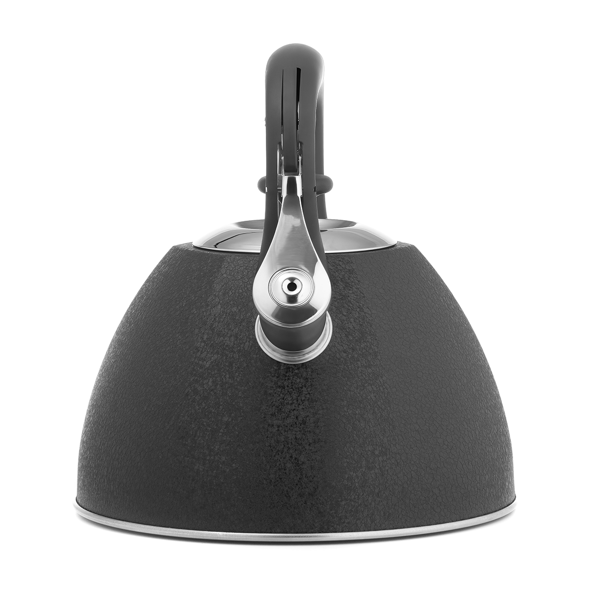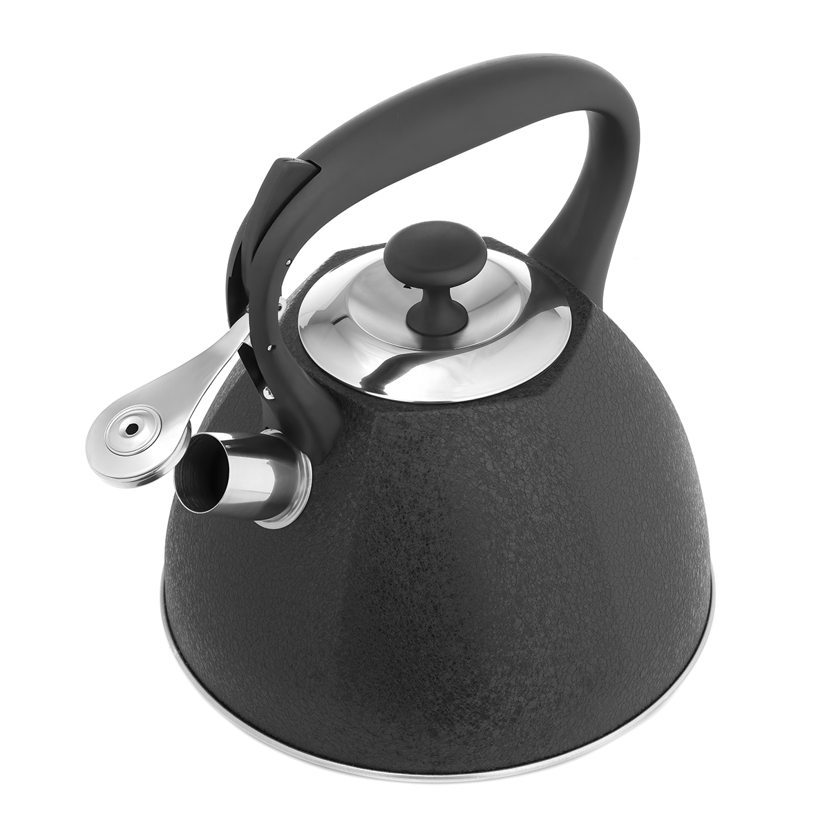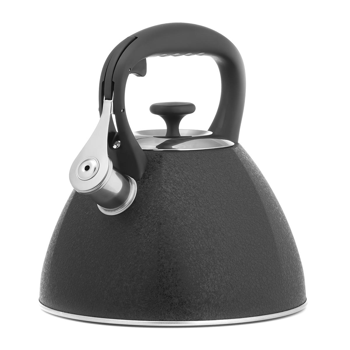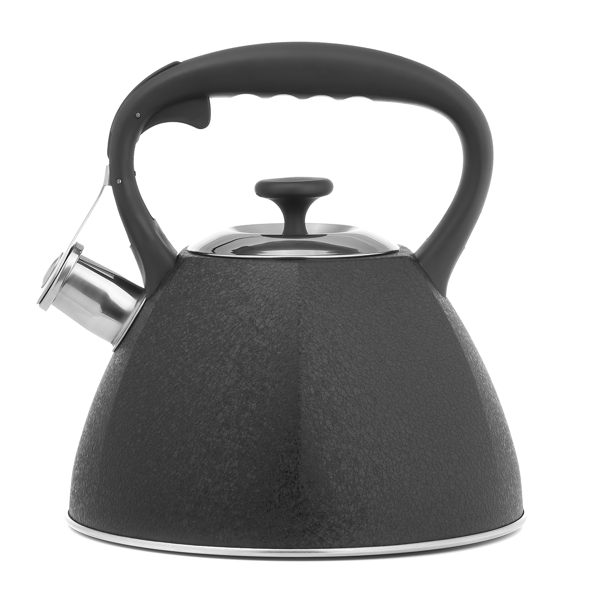 Современный чайник со свистком LARA – свежее решение для вашей кухни. Шестигранная форма корпуса, сочетание зеркальной полировки металла и черной фактуры корпуса выгодно выделяет его среди других моделей. Объема чайника достаточно для дружеских или семейных встреч. Чайник изготовлен из высококачественной нержавеющей стали с цветным термостойким покрытием снаружи и матовой полировкой корпуса внутри. Эргономичная рукоятка и ручка крышки выполнены из ненагревающегося нейлона черного цвета. Толстое индукционное капсулированное дно подходит для всех типов кухонных плит. Свисток с безопасным кнопочным механизмом.