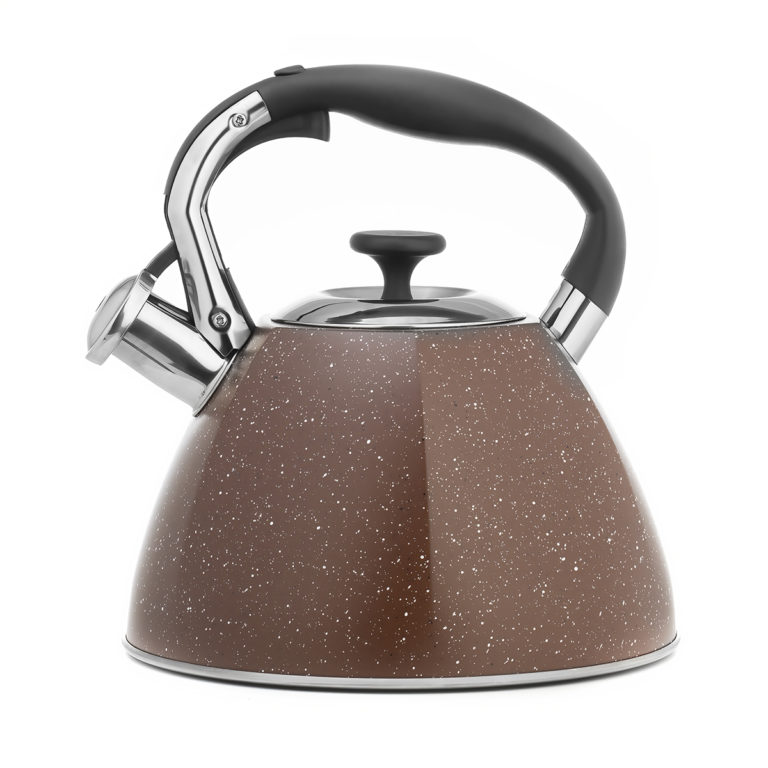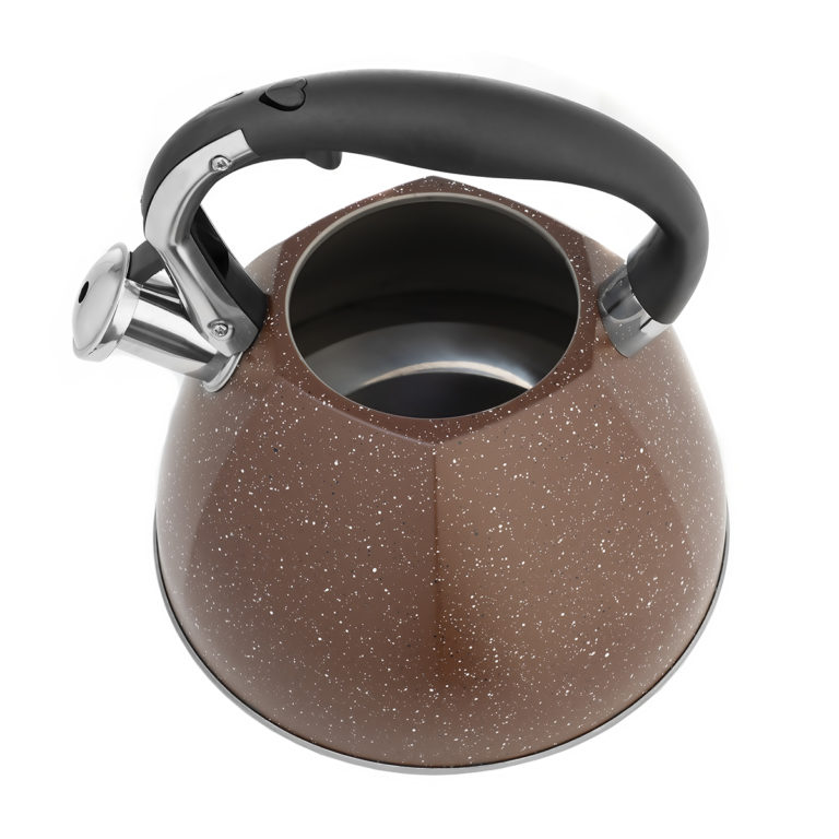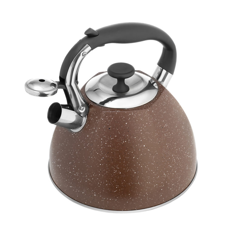 Современный чайник со свистком LARA – свежее решение для вашей кухни. Шестигранная форма корпуса, сочетание матовой мраморной окраски корпуса и зеркальной полировки металла выгодно выделяет его среди других моделей. Объема чайника достаточно для дружеских или семейных встреч. Чайник выполнен из высококачественной нержавеющей стали с цветным термостойким покрытием снаружи и матовой полировкой корпуса внутри. Эргономичная рукоятка и ручка крышки выполнены из ненагревающегося нейлона черного цвета. Толстое индукционное капсулированное дно подходит для всех типов плит. Свисток с безопасным кнопочным механизмом.