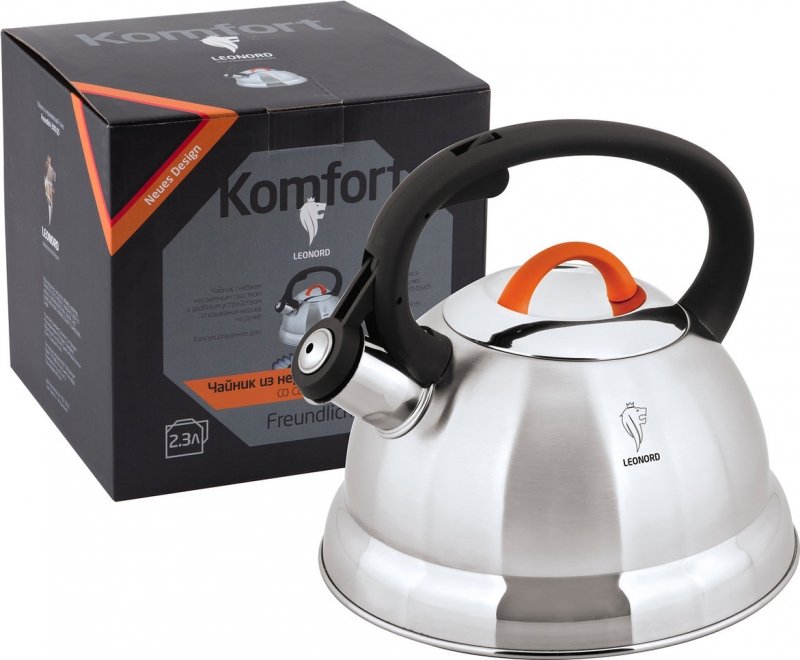 Чайник снабжен свистком и устройством открывания носика на ручке;