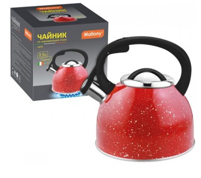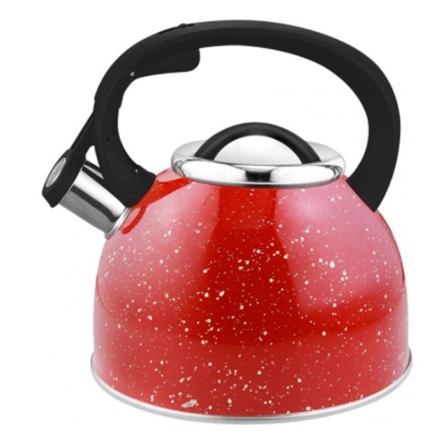 Чайник из нержавеющей стали # 201 со свистком, с крышкой, с ручкой из нейлона, матовый внутри/окрашенный под мрамор — снаружи (красный с белыми точками) матовая окрашенная поверхность корпуса дно — одинарное, подходит для всех типов плит, толщина стали — 0,3 мм, литраж — 2,5 литра, упаковка — цветная коробка. Название модели — "Arte" Материалы: нержавеющая сталь, нейлон
