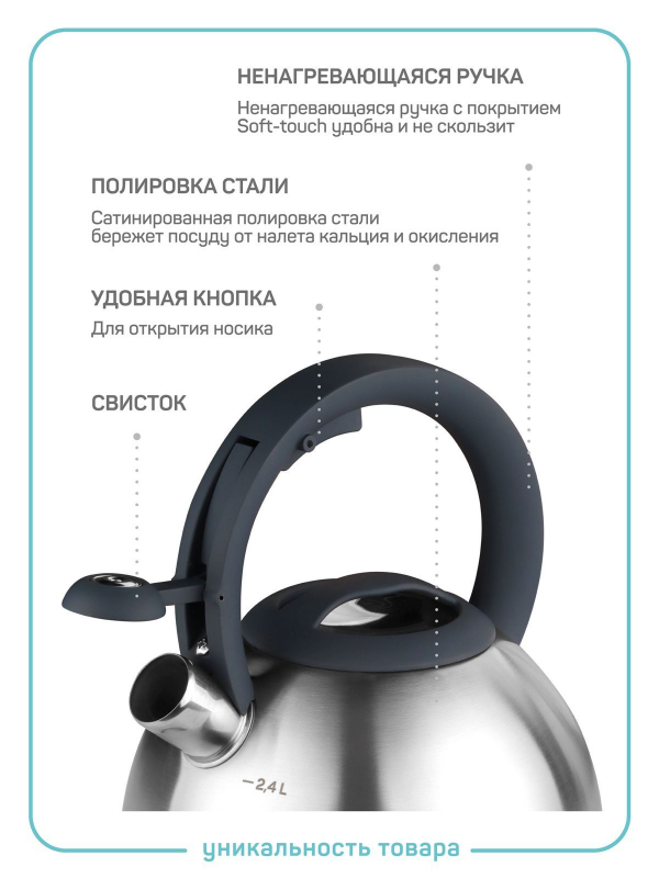 Носик изделия удобно открывается нажатием одной кнопки на ручке, имеющей нескользящее и не нагревающееся покрытие.