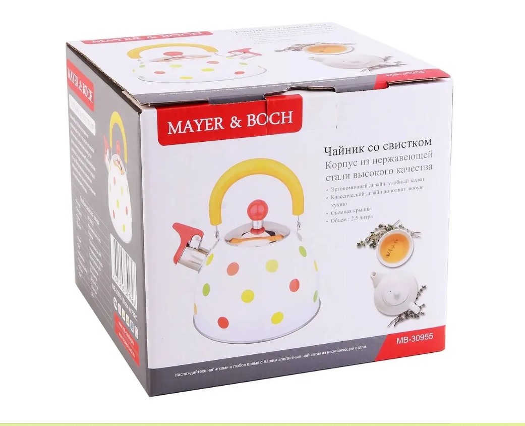 Чайник Mayer & Boch изготовлен из нержавеющей стали, что делает его весьма гигиеничным и устойчивым к износу при длительном использовании. Гладкая и ровная поверхность существенно облегчает уход за посудой. Выполненный из качественных материалов чайник при кипячении сохраняет все полезные свойства воды. Эргономичный дизайн, удобный захват. Классический дизайн дополнит любую кухню. Съемная крышка. Объем: 2,5 л.