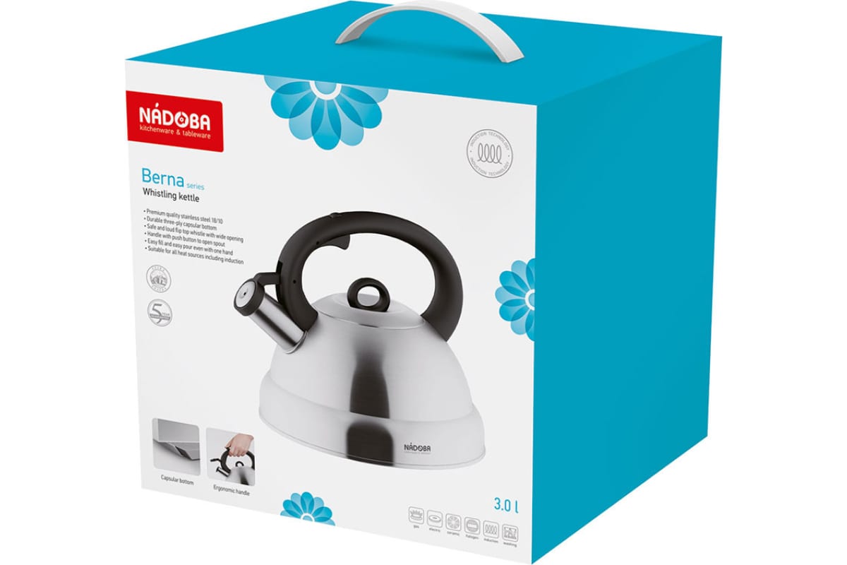 Громкий и безопасный свисток всегда вовремя проинформирует о том, что вода уже вскипела. Большой чайник Berna 3 л дает возможность вскипятить воду для большой компании. Изделие можно мыть в посудомоечной машине.