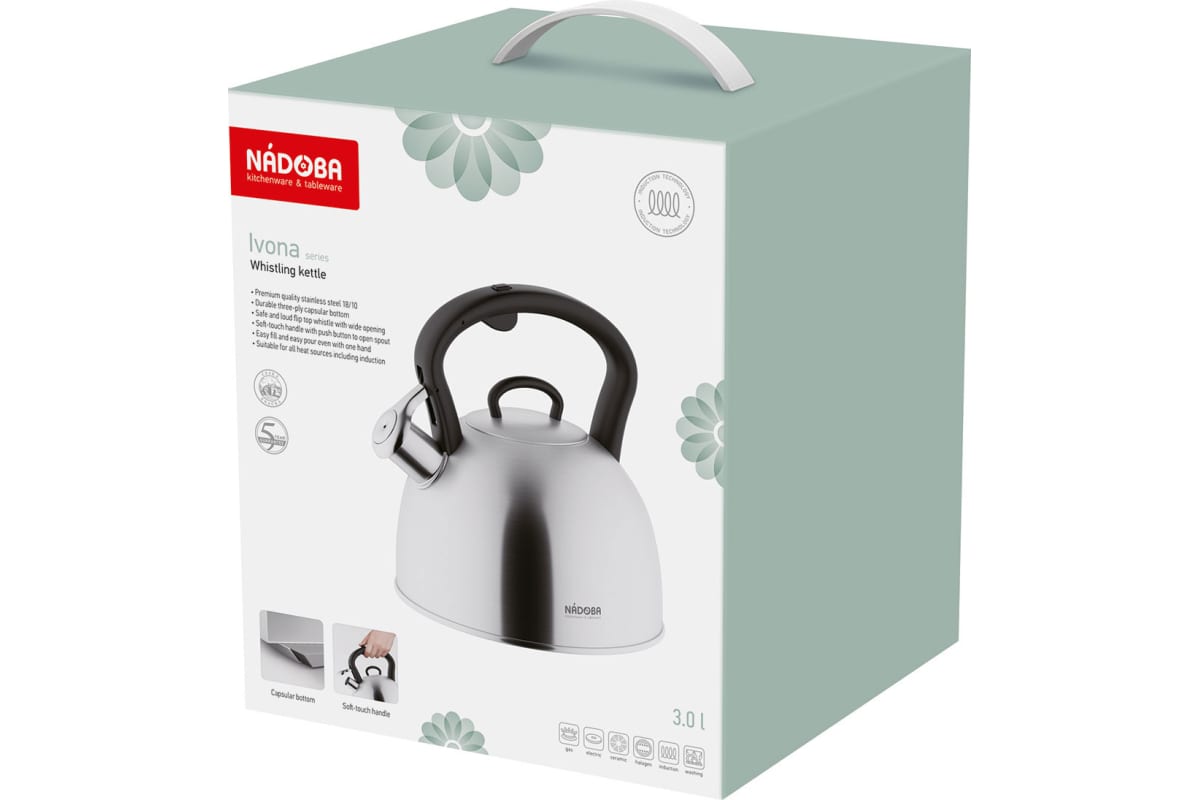 Чайник для всех плит со свитком 3л, серия IVONA 731801 выполнен из нержавеющей стали 18/10 и подходит для любых типов плит: газовых, индукционных, электрических, галогеновых, стеклокерамических.
