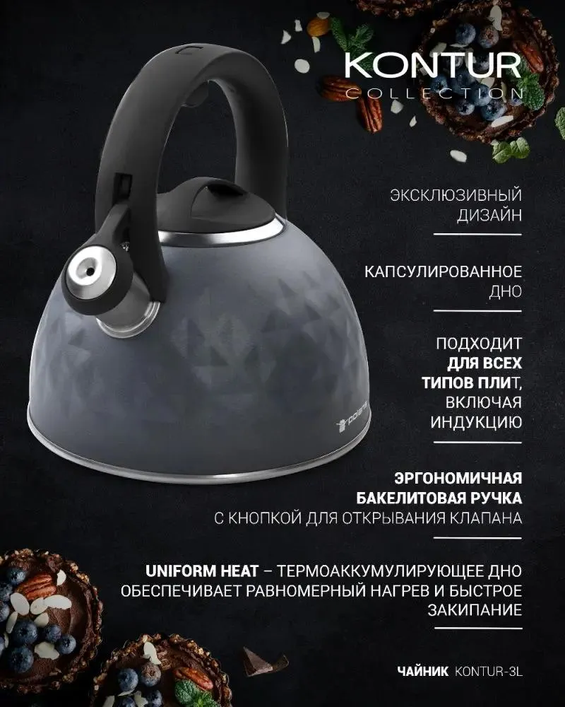 Чайник в стильном дизайне изготовлен из высококачественной нержавеющей стали 18/10. Технология UNIFORM HEAT - термоаккумулирующее дно обеспечивает равномерный нагрев и быстрое закипание. Клапан открывается кнопкой на ручке.