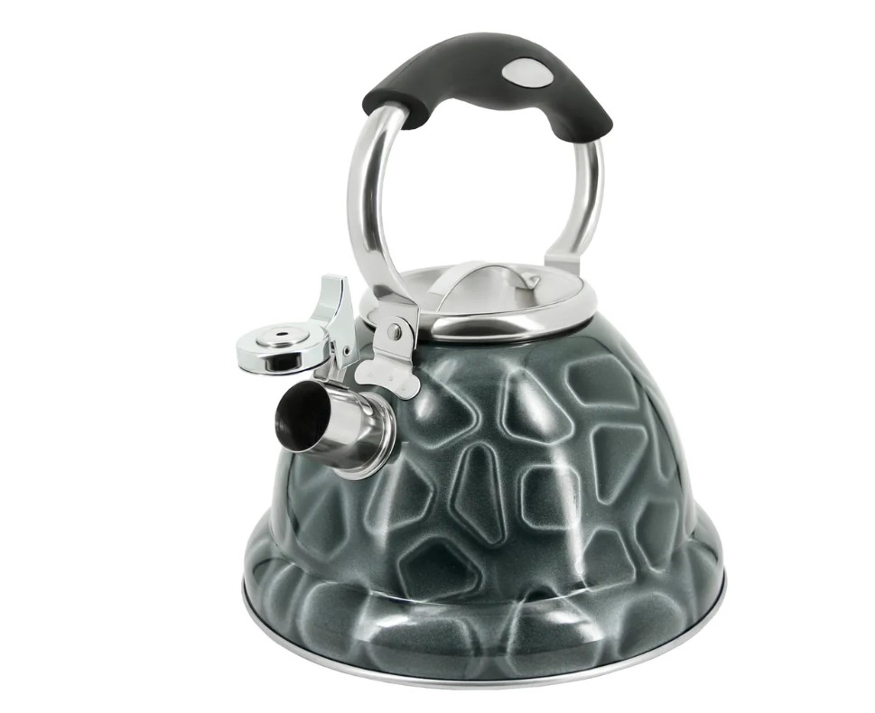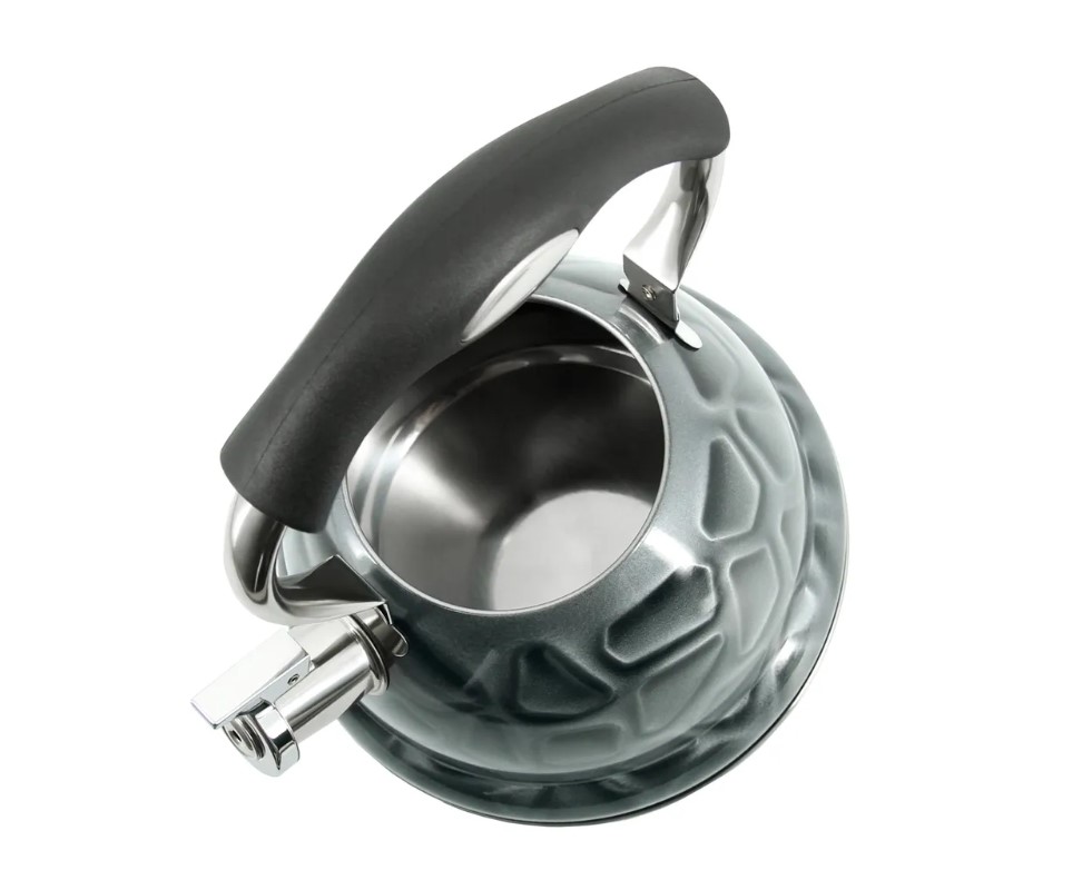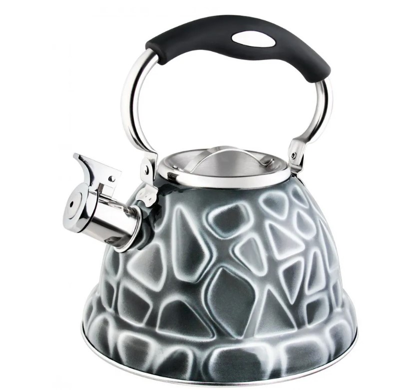 P-650196 Napoli Чайник со свистком, 3л. Модель выполнена по специальной пресс-форме с толщиной боковых стенок 0,4мм. Трехслойное дно, выполненное по технологии капсулирования, не деформируется и служит для равномерного распределения тепла. Ненагревающаяся нейлоновая ручка с кнопкой для открывания носика. Безопасный и громкий свисток вовремя проинформирует, что вода закипела. Высокопрочное покрытие чайника сохраняет отличный внешний вид изделия намного дольше. Подходит для всех типов нагревательных поверхностей. Материал нержавеющая сталь.