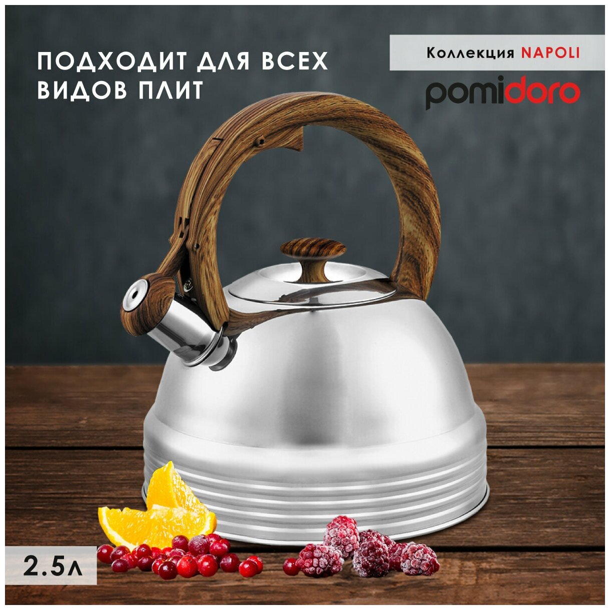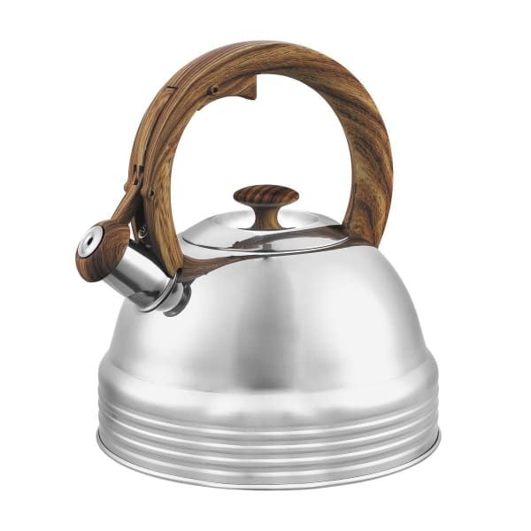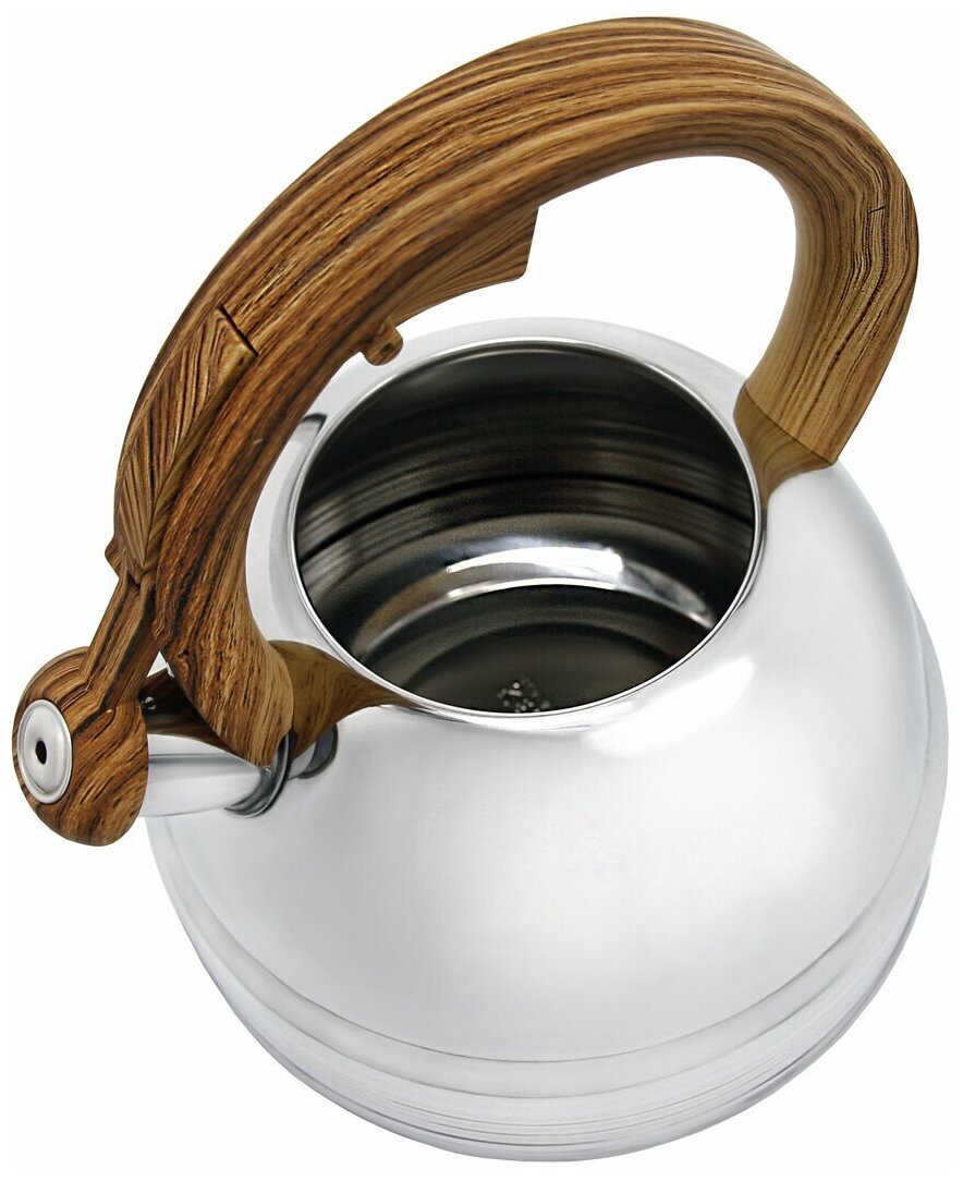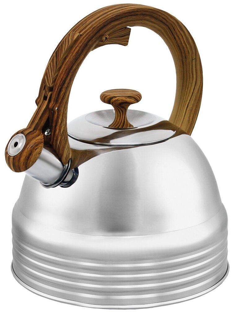 Модель выполнена по специальной пресс-форме с толщиной боковых стенок 0,4мм. Трехслойное дно, выполненное по технологии капсулирования, не деформируется и служит для равномерного распределения тепла. Ненагревающаяся нейлоновая ручка с кнопкой для открывания носика. Безопасный и громкий свисток вовремя проинформирует, что вода закипела. Высокопрочное покрытие чайника сохраняет отличный внешний вид изделия намного дольше. Подходит для всех типов нагревательных поверхностей. Материал нержавеющая сталь.