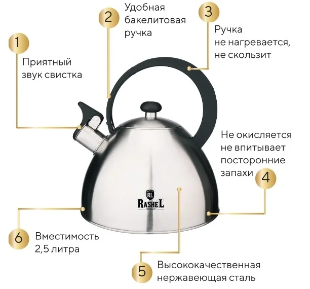 Чайник изготовлен из высококачественной нержавеющей стали. Нержавеющая сталь обладает высокой устойчивостью к коррозии, не окисляется и не впитывает посторонние запахи.