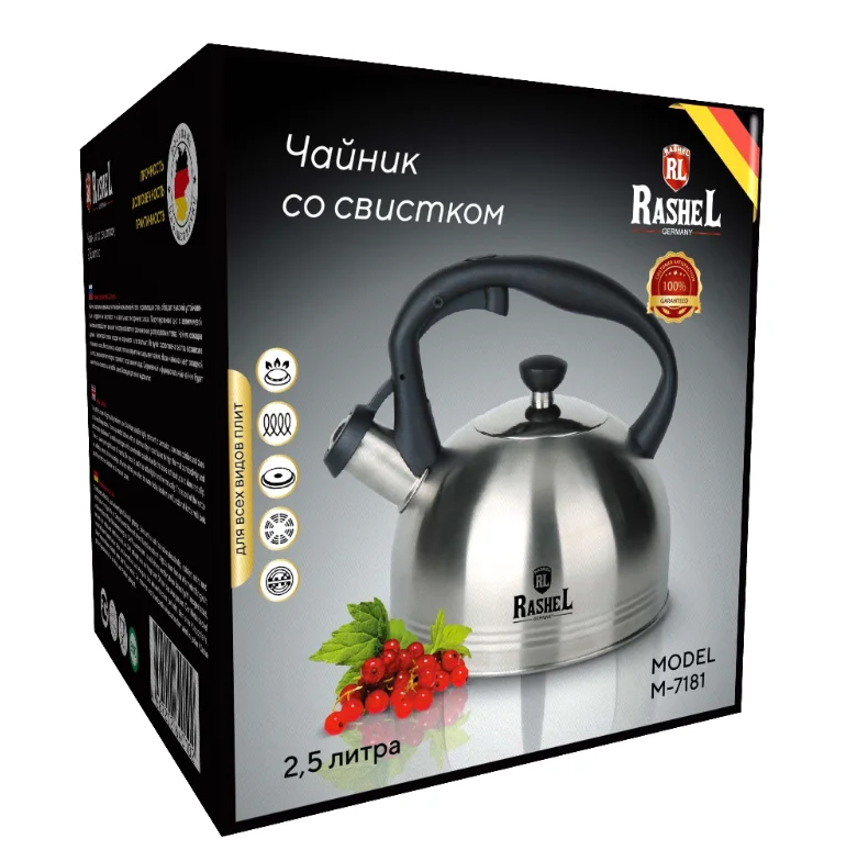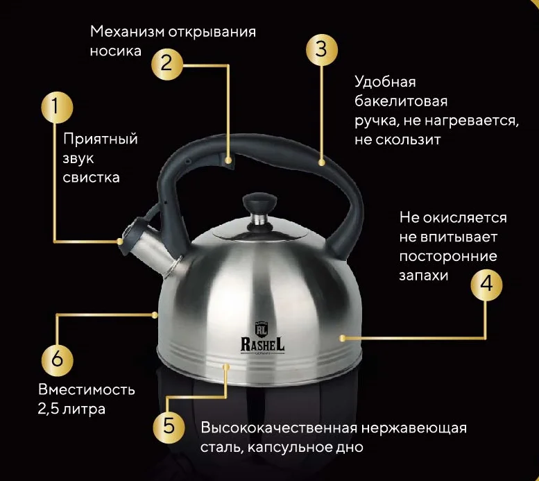 Чайник изготовлен из высококачественной нержавеющей стали. Нержавеющая сталь обладает высокой устойчивостью к коррозии, не окисляется и не впитывает посторонние запахи.