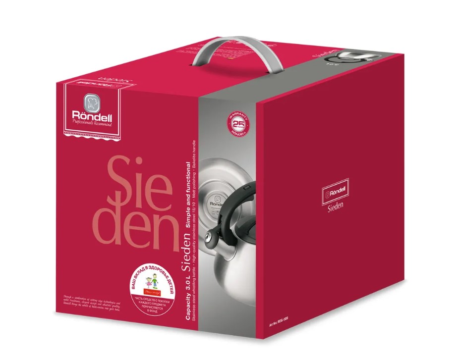Чайник Rondell "Sieden" изготовлен из высококачественной пищевой нержавеющей стали 18/10, благодаря чему не подвержен коррозии, устойчив к органическим кислотам, долговечен и прост в уходе. Матовое покрытие легко в уходе и обеспечивает безупречный внешний вид. Наличие свистка позволяет следить за кипением чайника. Эргономичная ручка из бакелита позволяет открывать свисток и наливать воду одной рукой.
