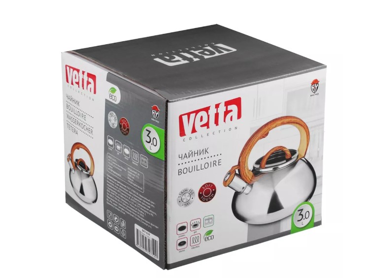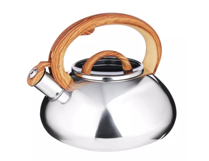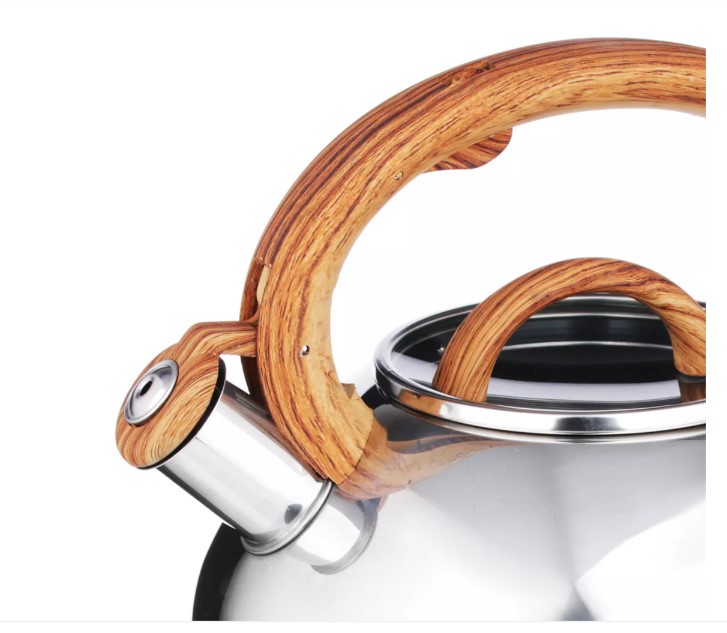 Чайник объемом 3 л изготовлен из зеркальной нержавеющей стали, оснащен несъемным свистком на кнопке, стеклянной крышкой и эргономичной ручкой из бакелита с силиконовым напылением расцветки "под дерево", с капсульным дном, подходит использования на всех типах плит, включая индукцию.