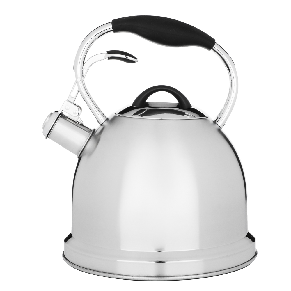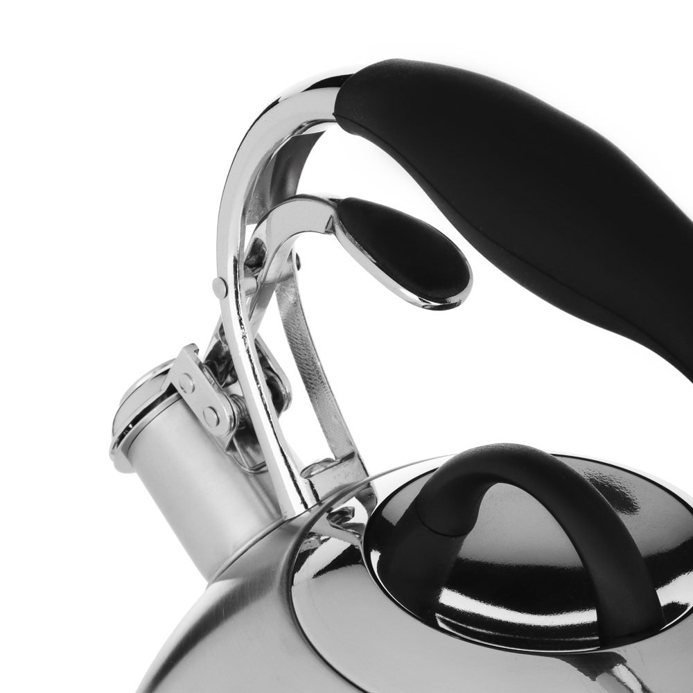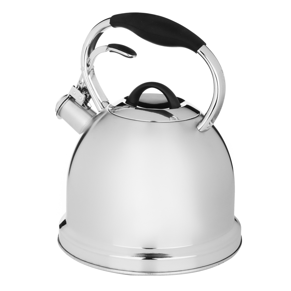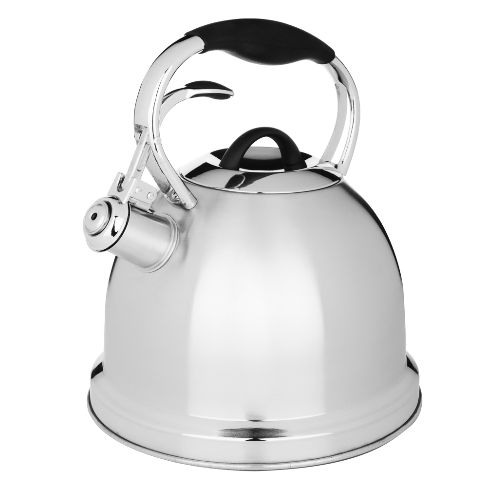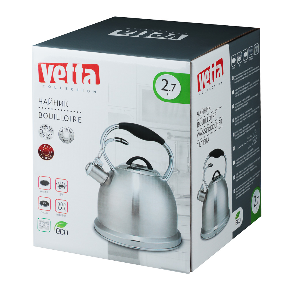 Стальной чайник 2,7 л из нержавеющей стали со свистком займет достойное место на кухне. Имеет толстое капсульное дно, которое равномерно прогревается и долго сохраняет тепло внутри, замедляя остывание воды. Эргономичная ручка с покрытием «soft-touch» не выскальзывает из рук, не нагревается и имеет приятную на ощупь поверхность. Свисток фиксируется в открытом состоянии путем нажатия на специальный рычажок. Чайник легко моется, не подвержен коррозии и сохраняет первоначальный вид на протяжении многих лет. Подходит для всех типов плит, включая индукционную.
