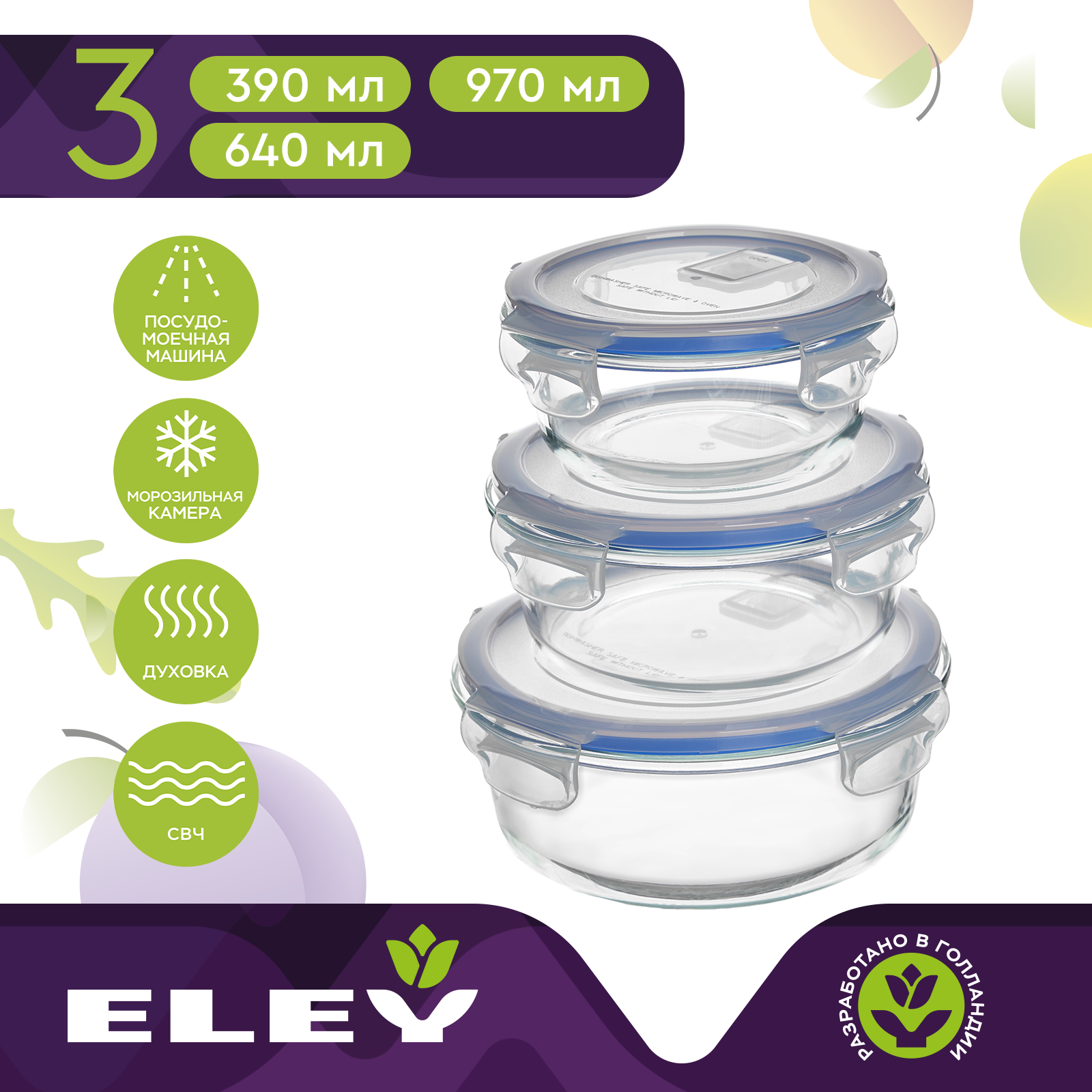 Набор круглых контейнеров Eley ELSТP002B 390мл: 640мл; 970мл, синие