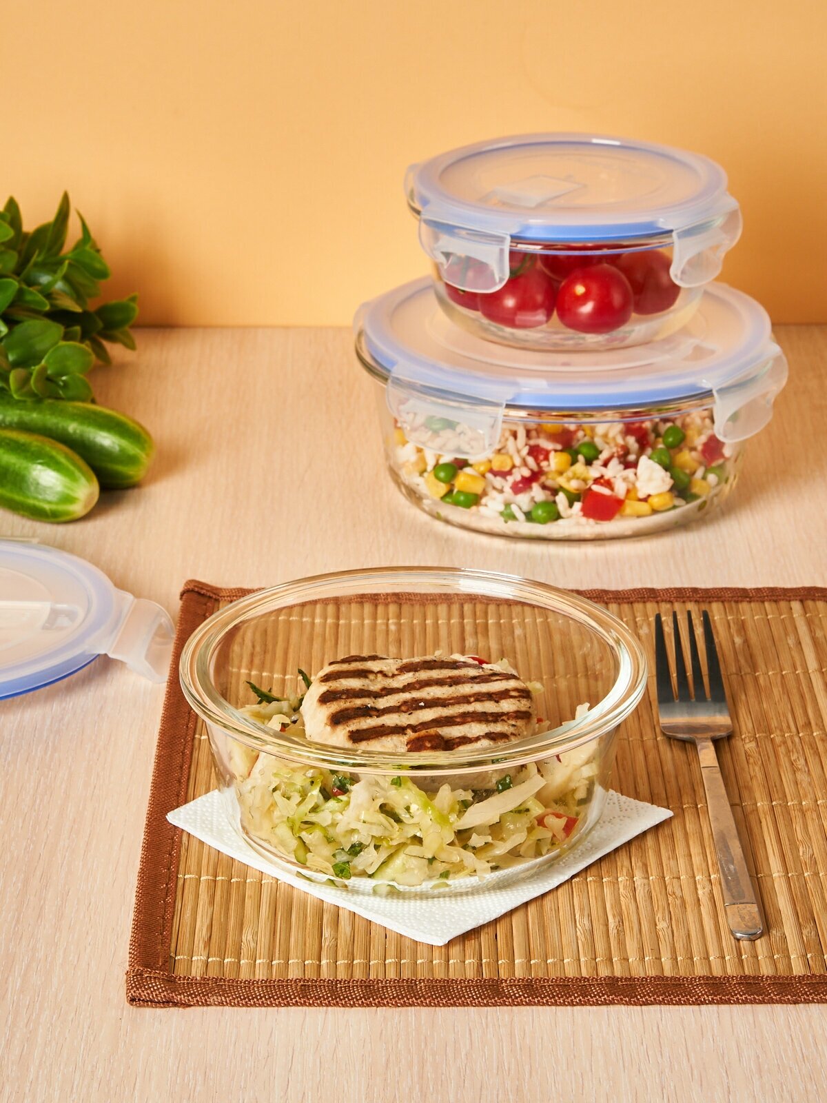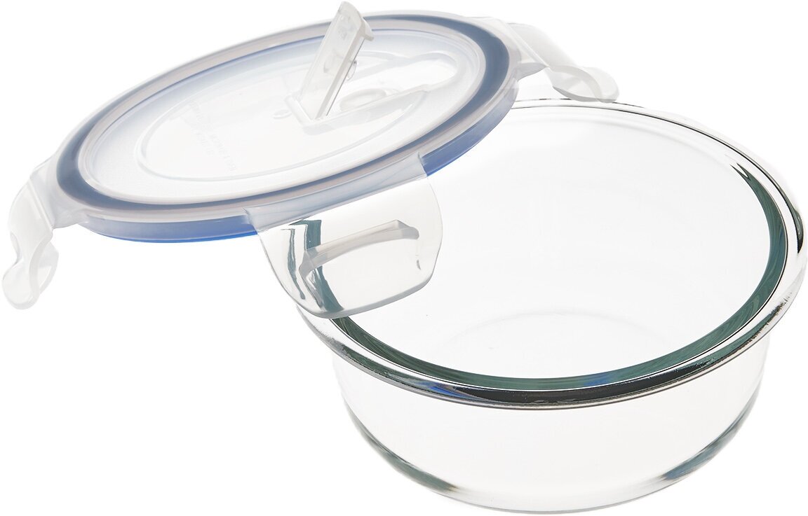 с пластиковой крышкой со встроенным клапаном. Можно использовать в микроволновой печи и духовке (без крышки), в холодильнике и морозильной камере, можно мыть в посудомоечной машине. Стеклянную форму можно использовать как форму для запекания, она выдерживает нагрев до 400 градусов.