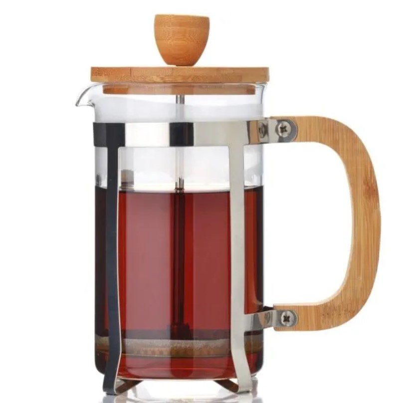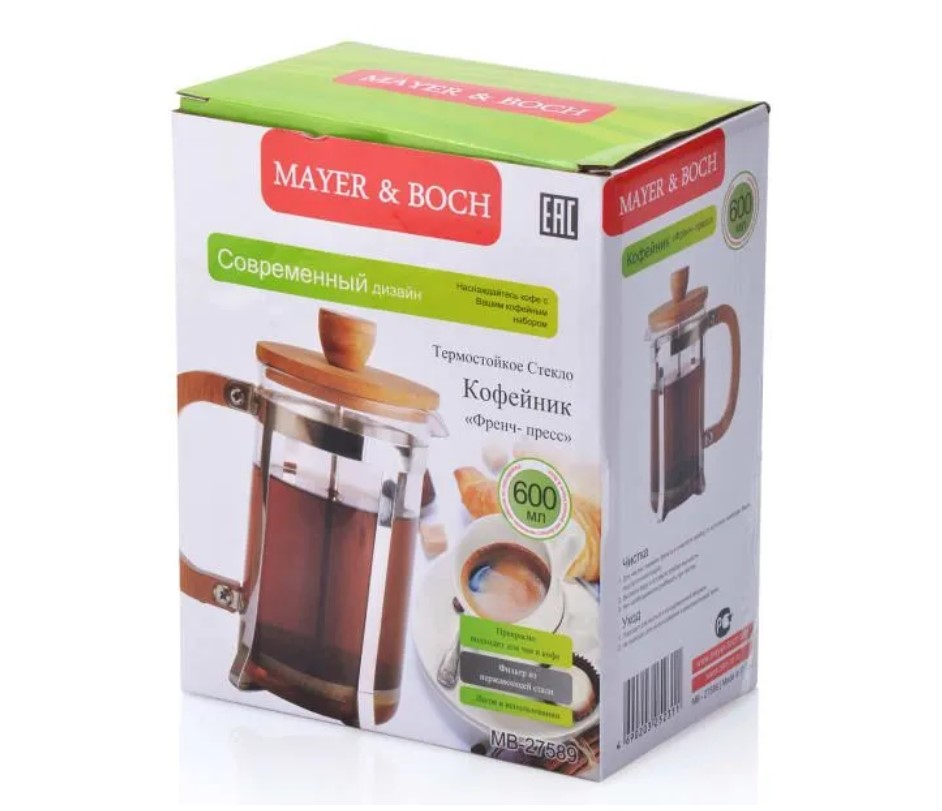 Френч-пресс изготовлен из высокотехнологичных материалов на современном оборудовании. Колба из высококачественного термостойкого стекла обрамлена стальными пластинами в различных дизайнерских решениях. Фильтр-поршень из нержавеющей стали выполнен по технологии "press-up" для обеспечения равномерной циркуляции воды в чайнике. Удобная, ненагревающаяся ручка выполнена из бамбука. Практичный и стильный дизайн полностью соответствует последним модным тенденциям в создании предметов бытовой техники. Френч-пресс Mayer & Boch позволит быстро и без усилий приготовить свежий ароматный кофе или чай. Подходит для мытья в посудомоечной машине. Не использовать чистящие и дезинфицирующие средства, содержащие хлор. Не подходит для использования на открытом огне и микроволновой печи.