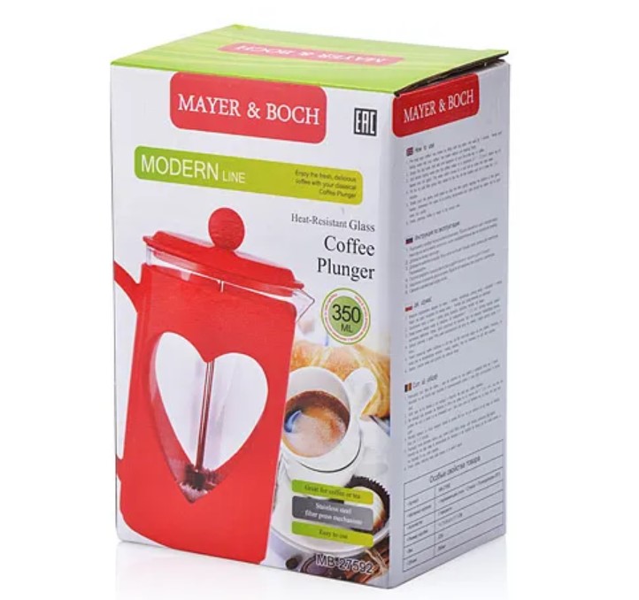 Френч-пресс изготовлен из высокотехнологичных материалов на современном оборудовании. Колба из высококачественного термостойкого стекла заключена в корпус из яркого пищевого пластика. Фильтр-поршень из нержавеющей стали выполнен по технологии "press-up" для обеспечения равномерной циркуляции воды в чайнике. Удобная, не нагревающаяся ручка и крышка также выполнены из пластика. Практичный и стильный дизайн полностью соответствует последним модным тенденциям в создании предметов бытовой техники. Среди цветовой гаммы выпускаемых изделий любой покупатель сможет подобрать себе Френч-Пресс под свой индивидуальный кухонный интерьер. Френч-пресс MAYER&BOCH позволит вам быстро и без усилий приготовить свежий ароматный кофе или чай.