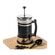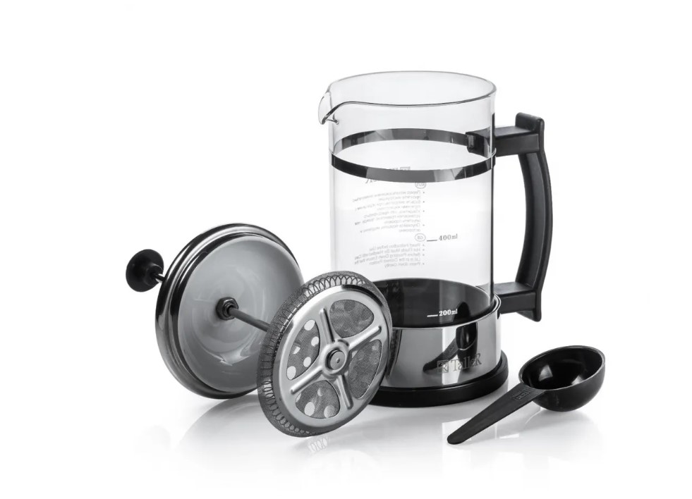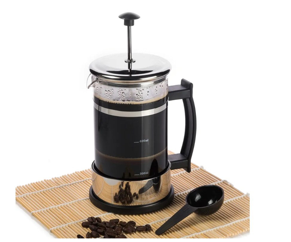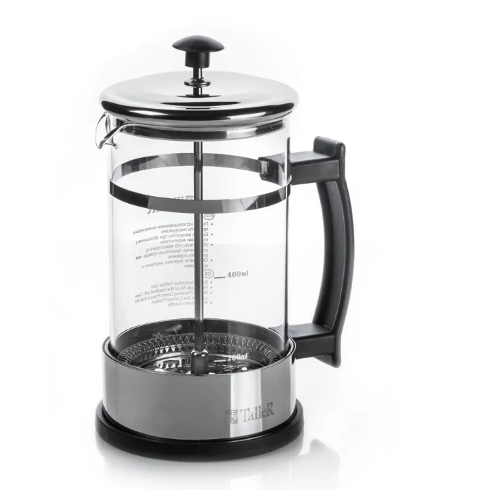 Толщина колбы - 2 мм, толщина корпуса - 0,8 мм, толщина пресс-фильтра - 0,3 мм. Объем френч-пресса - стандартный. Подойдет для заваривания кофе, чая, трав.