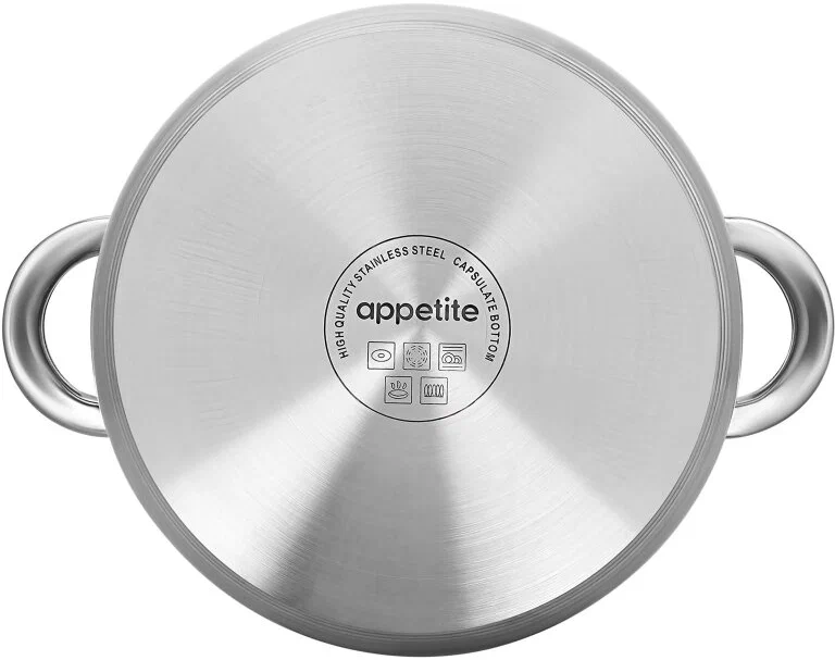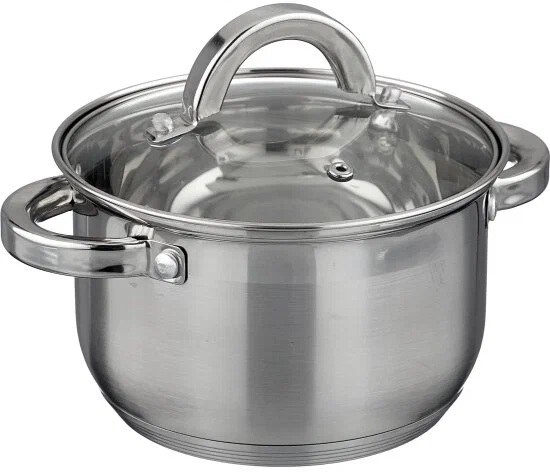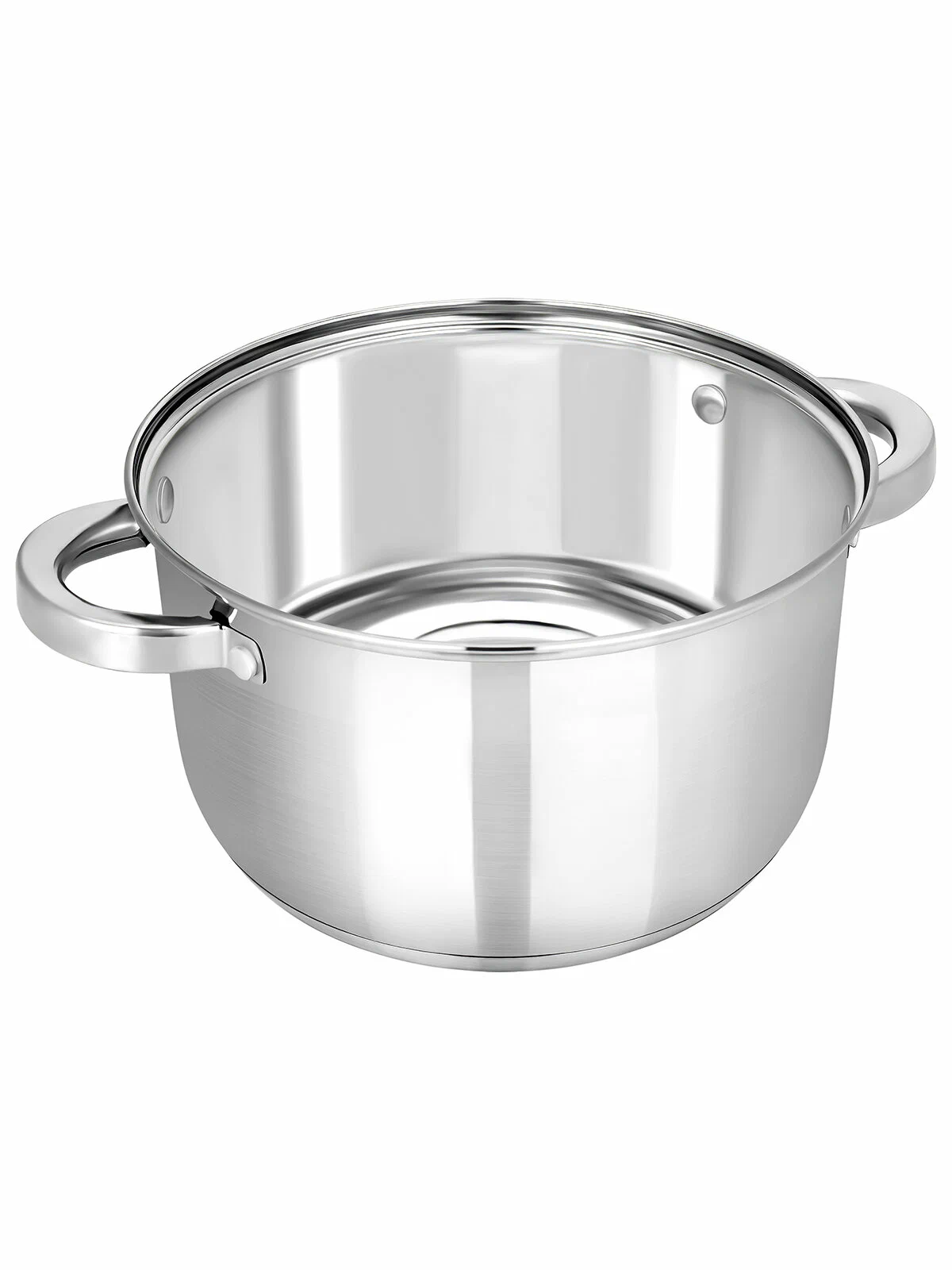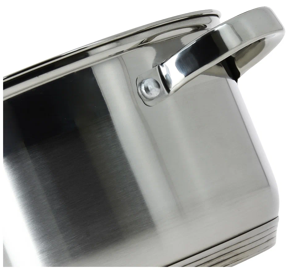 кастрюля имеет трехслойное термоаккумулирующее дно; внутри имеется мерная шкала; крышка выполнена из термостойкого стекла; ручки выполнены из нержавеющей стали