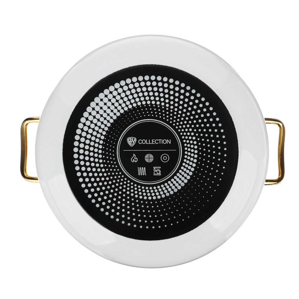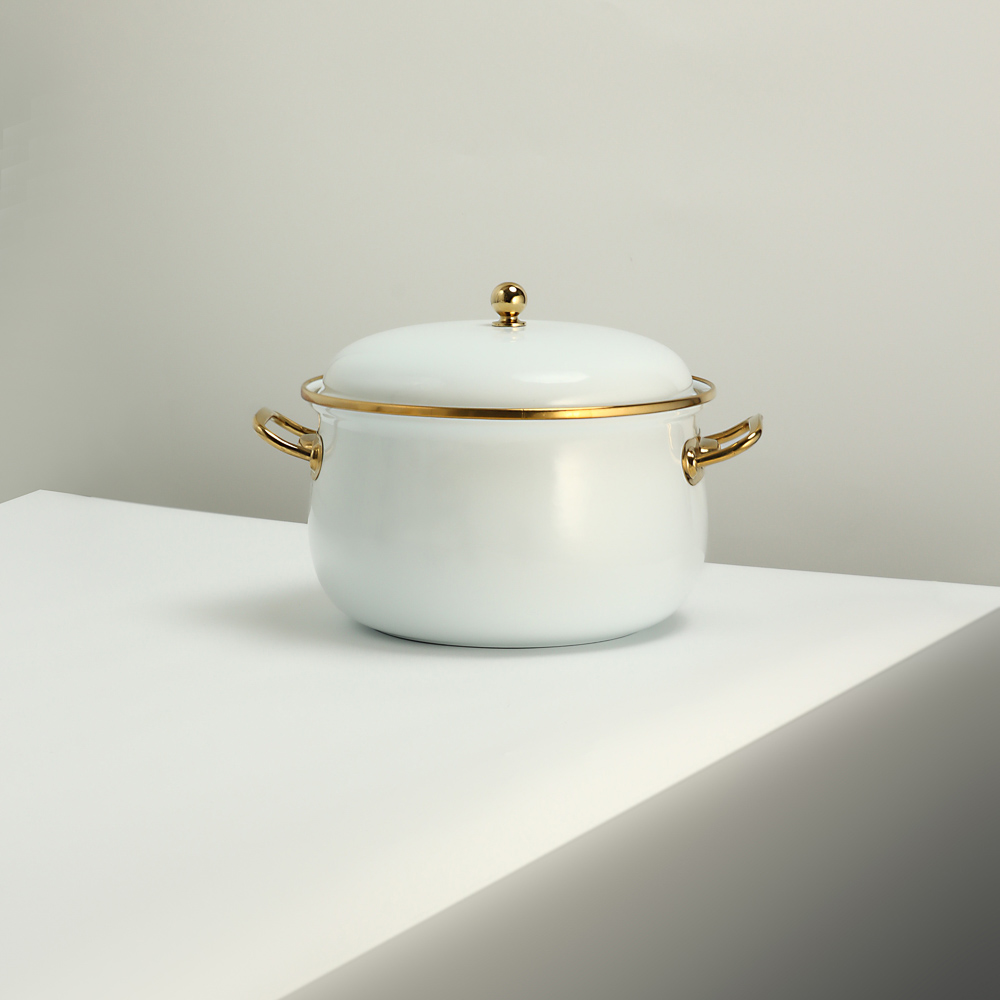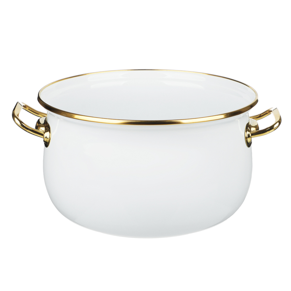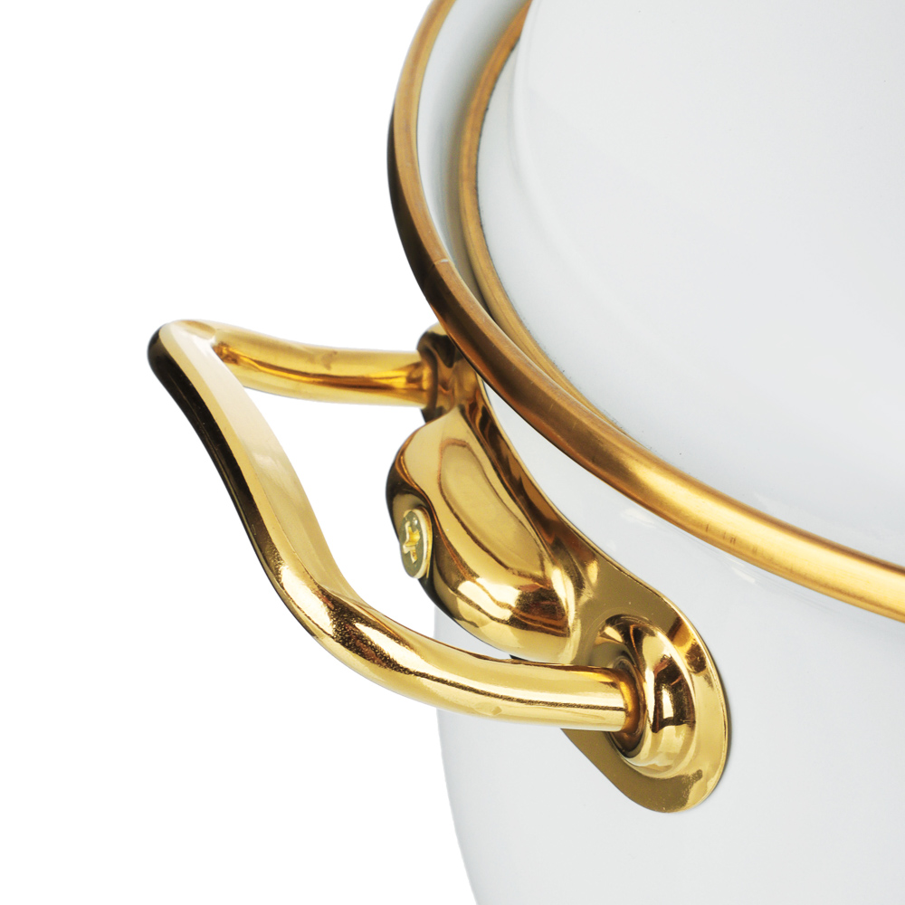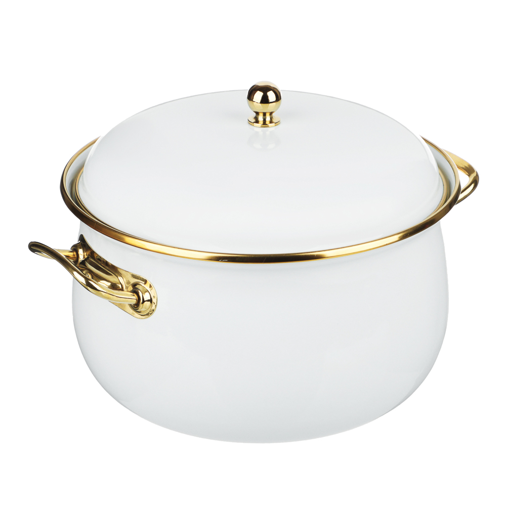 Изящный дизайн в белом цвете с золотым оформлением ручек, ободка и ручки крышки делает изделие настоящим украшением кухни и будет выигрышно смотреться в любом интерьере.