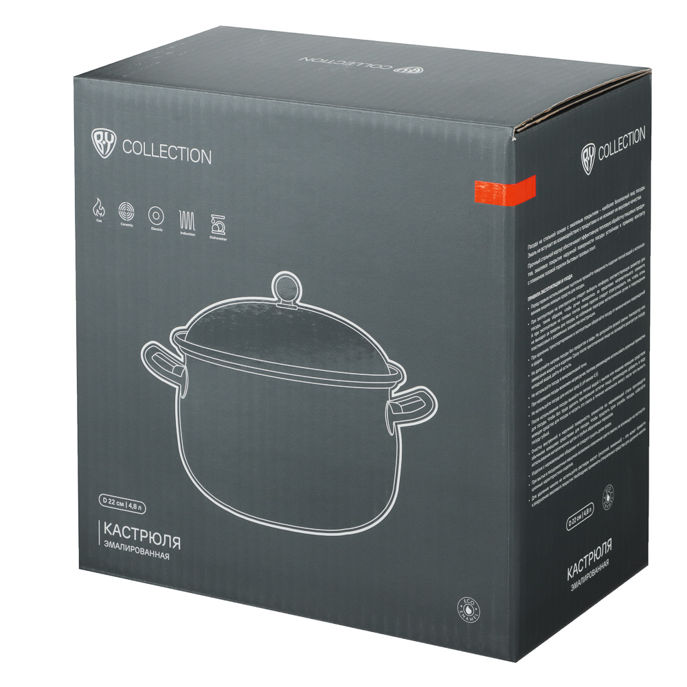 Эмалированная кастрюля BY с крышкой 22 см объёмом 4,8 л подходит для приготовления супов, холодца, компотов и других блюд.
