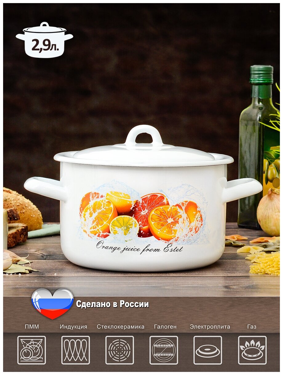 Кастрюля Эстет изготовлена из высококачественного стального проката и покрыта стеклокерамической эмалью. Внутри и снаружи трехслойное глянцевое эмалированное покрытие. Эмалевое покрытие, являясь стекольной массой, не вызывает аллергию и надежно защищает пищу от контакта с металлом. Кроме того, такое покрытие долговечно, оно устойчиво к механическому воздействию, не царапается, а стальная основа практически не подвержена механической деформации, благодаря чему срок эксплуатации увеличивается. Крышка с эмалированным покрытием оснащена удобной ручкой, . Она плотно прилегает к краю, сохраняя аромат блюд. Подходит для всех типов плит, включая индукционные. Можно мыть в посудомоечной машине.