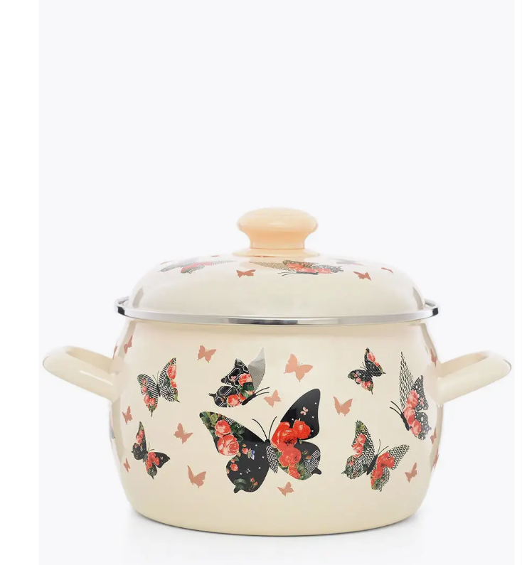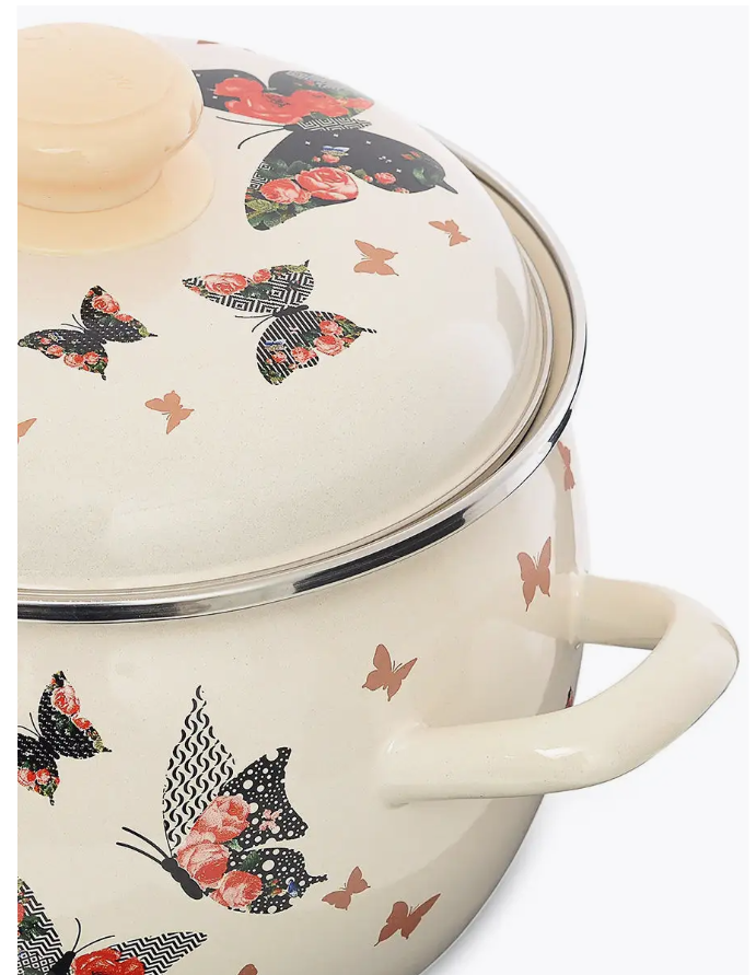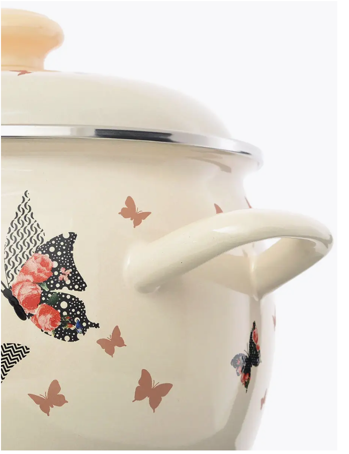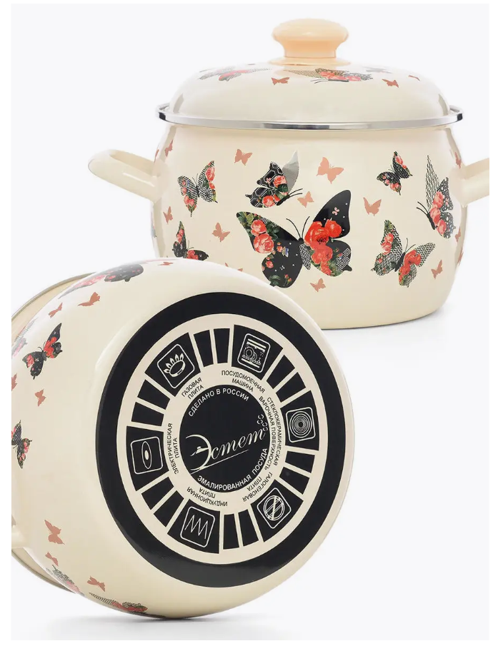 Кастрюля Эстет "Бабочки" изготовлена из высококачественного стального проката и покрыта стеклокерамической эмалью. Внутри и снаружи - трехслойное глянцевое эмалированное покрытие. Эмалевое покрытие, являясь стекольной массой, не вызывает аллергию и надежно защищает пищу от контакта с металлом. Кроме того, такое покрытие долговечно, оно устойчиво к механическому воздействию, не царапается, а стальная основа практически не подвержена механической деформации, благодаря чему срок эксплуатации увеличивается. Крышка с эмалированным покрытием оснащена удобной ручкой, . Она плотно прилегает к краю, сохраняя аромат блюд. Подходит для всех типов плит, включая индукционные. Можно мыть в посудомоечной машине.