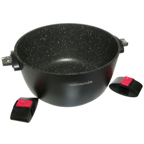 Съёмная бакелитовая ручка оснащена кнопкой с простым и удобным механизмом, что позволяет экономить место при хранении или использовать посуду в духовом шкафу.