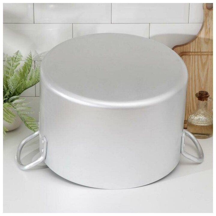 Изготовлен из прочного штампованного алюминия, устойчивого к температурному воздействию. Изделие оснащено металлическими ручками и идет в комплекте с металлической крышкой. Соответствует ГОСТ и отвечает всем санитарно-гигиеническим требованиям.