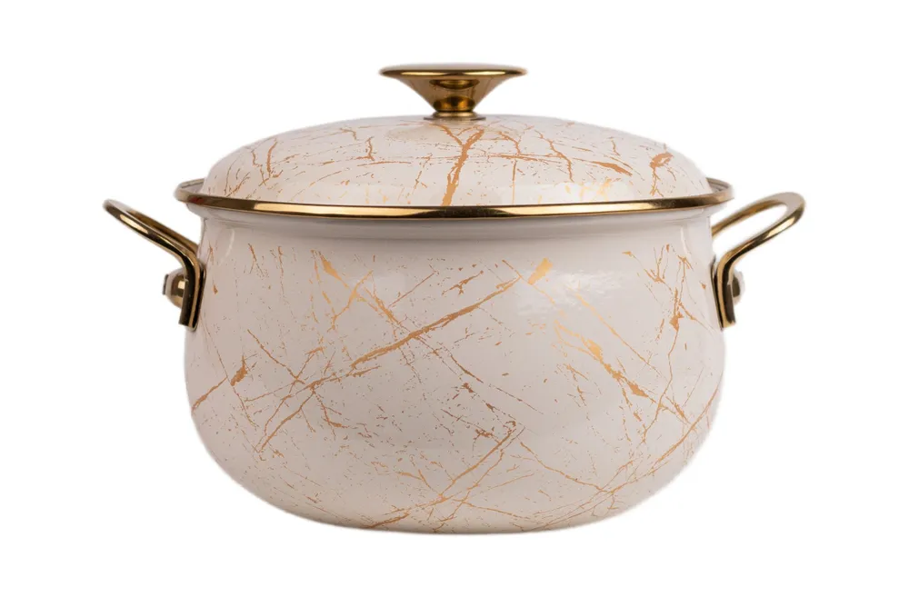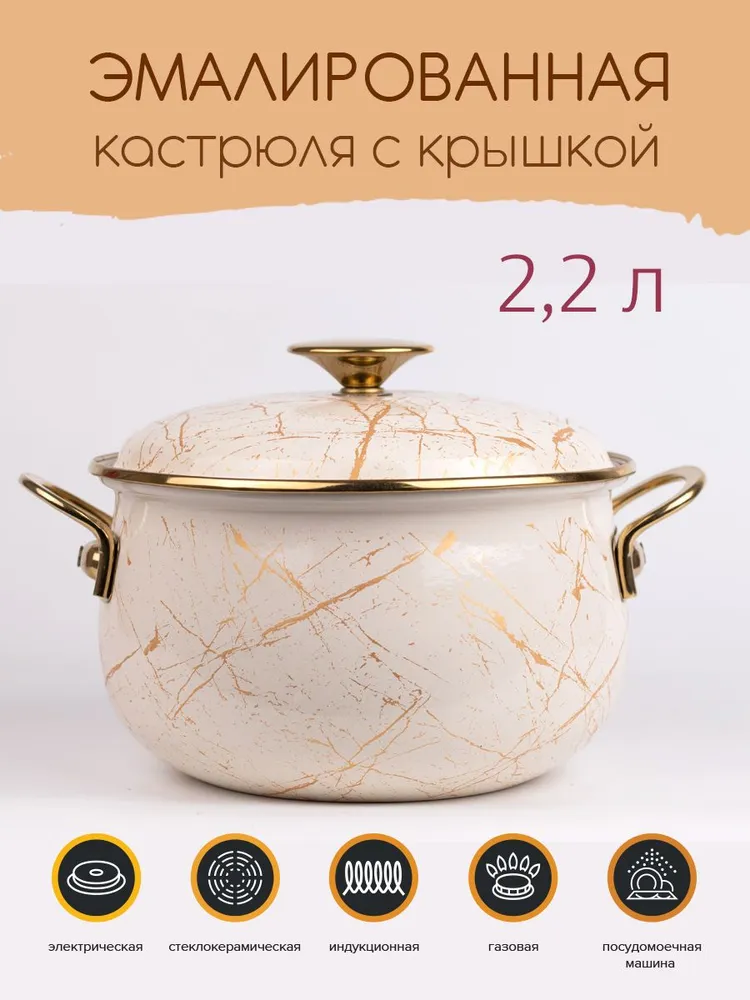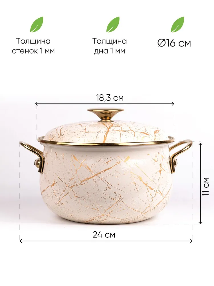 Кастрюля обладает двухслойным покрытием из жаропрочной эмали. Дно сделано из ферромагнитного материала, поэтому модель можно эксплуатировать на индукционных плитах. Допускается нагрев на стеклокерамических, газовых и чугунных конфорках. Объем составляет 2,2 л. Диаметр — 16 см, высота — 18 см. В комплект входит крышка с отверстием для выпуска пара. Посуду можно чистить вручную мягкой губкой или салфеткой, неабразивными средствами бытовой химии или в посудомоечной машине. Ручки изготовлены из металла и окрашены в золотистый цвет. Вес — 1,3 кг