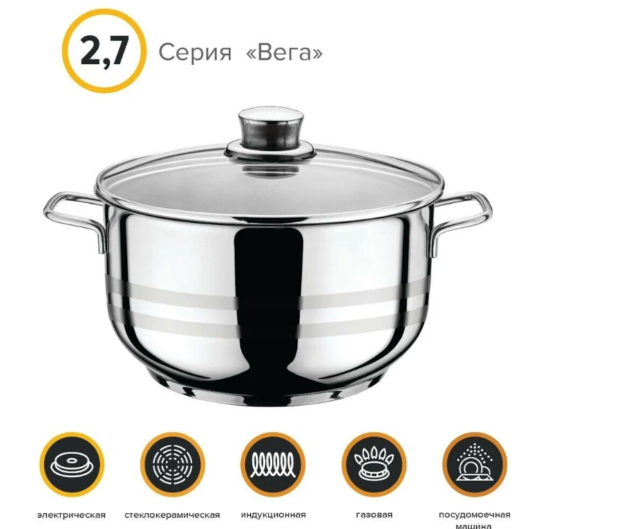 Изделие можно использовать на газовых, чугунных, стеклокерамических, индукционных и галогеновых конфорках. В комплекте прилагается стеклянная крышка с клапаном для выпуска пара. Допускается мойка в посудомоечной машине.
