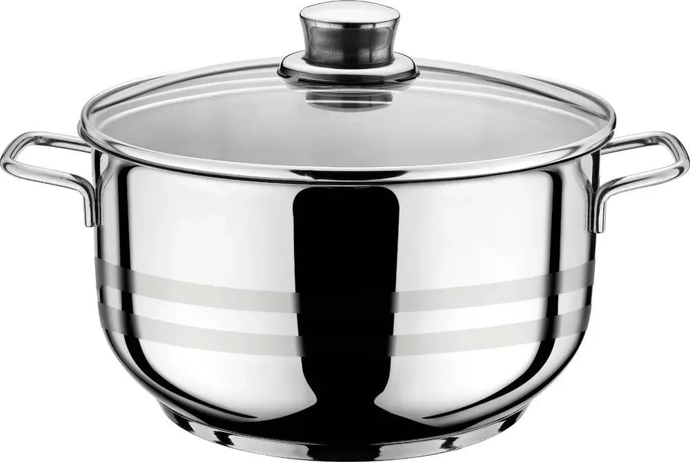 Изделие можно использовать на газовых, чугунных, стеклокерамических, индукционных и галогеновых конфорках. В комплекте прилагается стеклянная крышка с клапаном для выпуска пара. Допускается мойка в посудомоечной машине.