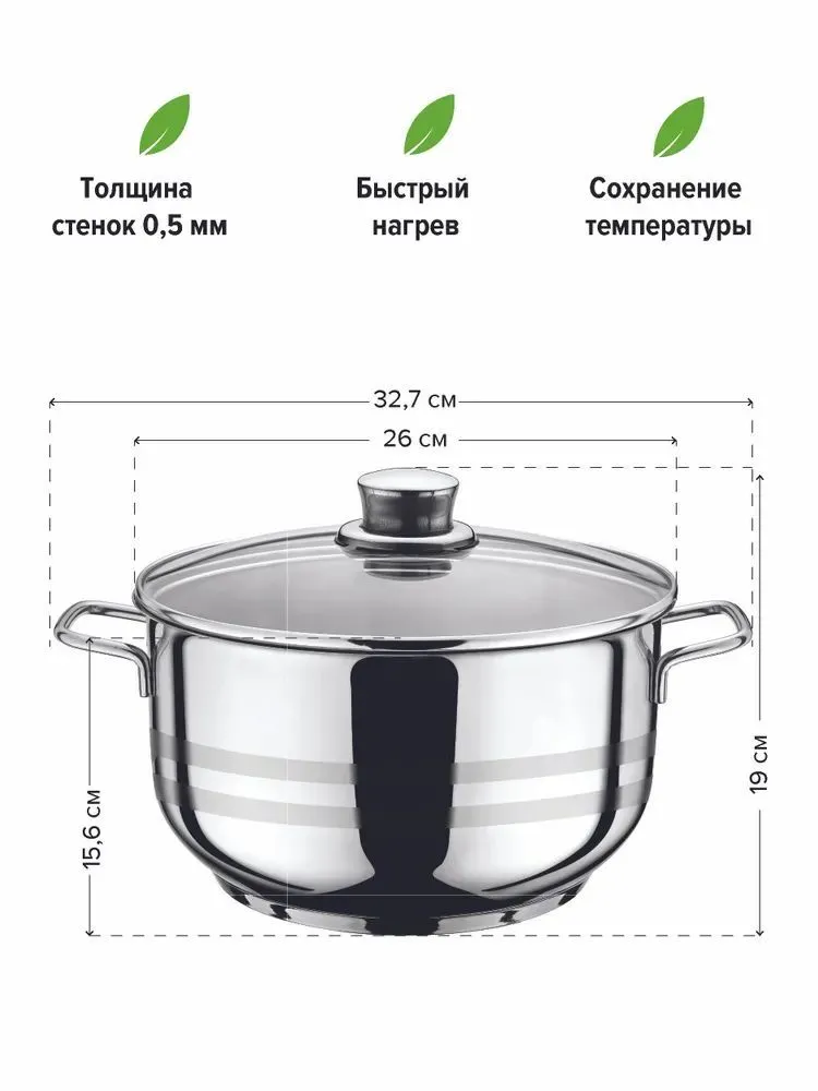 Кастрюля обладает объемом 5,6 л. Габаритные размеры изделия — 25,7х20,2х13,5 см, толщина дна — 3 мм, стенки — 0,5 мм. Корпус и ручки модели выполнены из нержавеющей стали с антипригарным покрытием. Кастрюля оборудована алюминиевым дном.